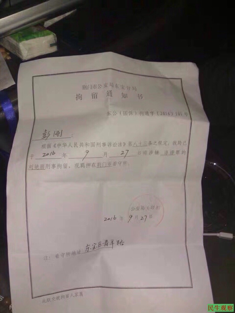 9月28日早上刘艳丽的丈夫彭先生告诉本网,刘艳丽26号十一点多被荆门市东宝区公安分局警察带走,至27号下午他已经收到刑事拘留通知书,刘艳丽被以涉嫌诽谤罪刑拘,关在荆门市看守所。刑拘通知书是昨天下午四点当地警方送到他家去的。彭先生认为这件事有误会,所以希望等几天看刘艳丽能不能获释。