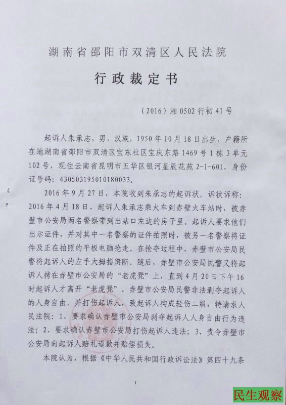 民生观察工作室2016年9月30日消息:朱承志起诉赤壁市公安局警察将其打伤一案被邵阳双清区法院裁定因证据不足不予受理。