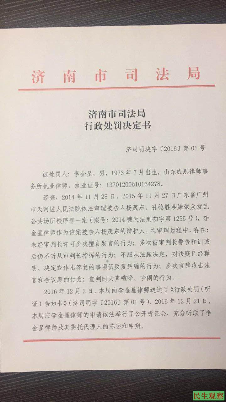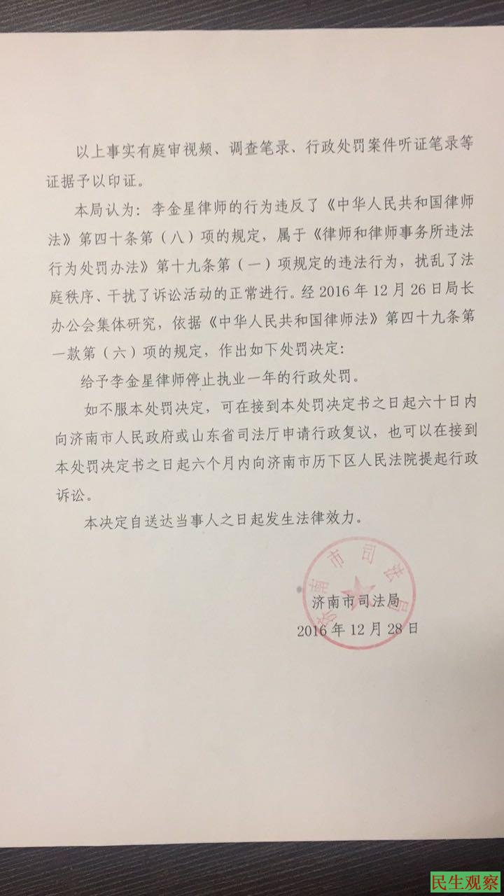 [民生观察工作室2016/12/29消息]12月28日,李金星律师收到被停止执业一年的决定书后,立即在网络社区上发布个人声明,他认为行政处罚完全是违法的,并表示将提起行政诉讼。