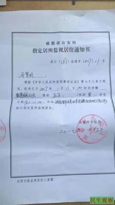 据王飞夫人冯雪玲女士介绍,今日(1月13日)中午,她接到黄龙溪派出所副所长送来的《监视居住通知书》,得知王飞从今日零时开始被指定居所监视居住。对于关押地点及期限的询问,对方称只负责送达,有事找成都市公安局国保支队。随后冯女士多次拨打国保支队电话,均无人接听。