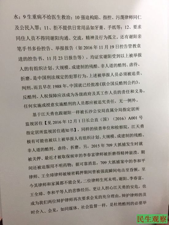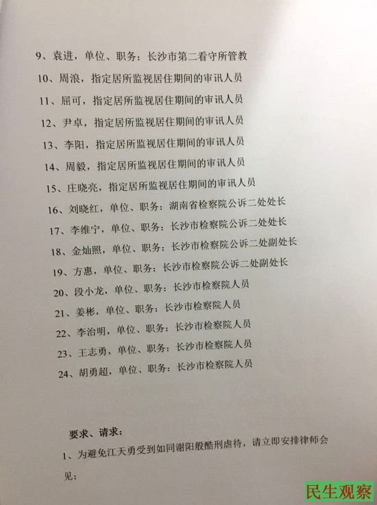 [民生观察工作室2017/02/05消息]覃臣寿、陈进学律师昨日(2月4日)向最高检察院、公安部等六个部门,邮寄《再次会见、举报及回避要求书、申请书》。要求会见被拘捕两个多月的江天勇,并举报24名涉嫌刑讯逼供的公安及检察院人员。