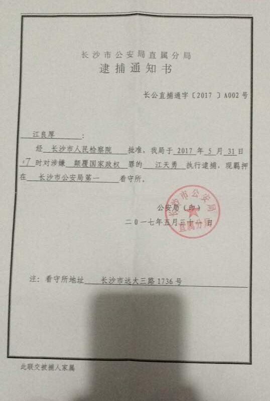 江天勇家属收到批捕通知书 罪名被改为“颠覆罪”