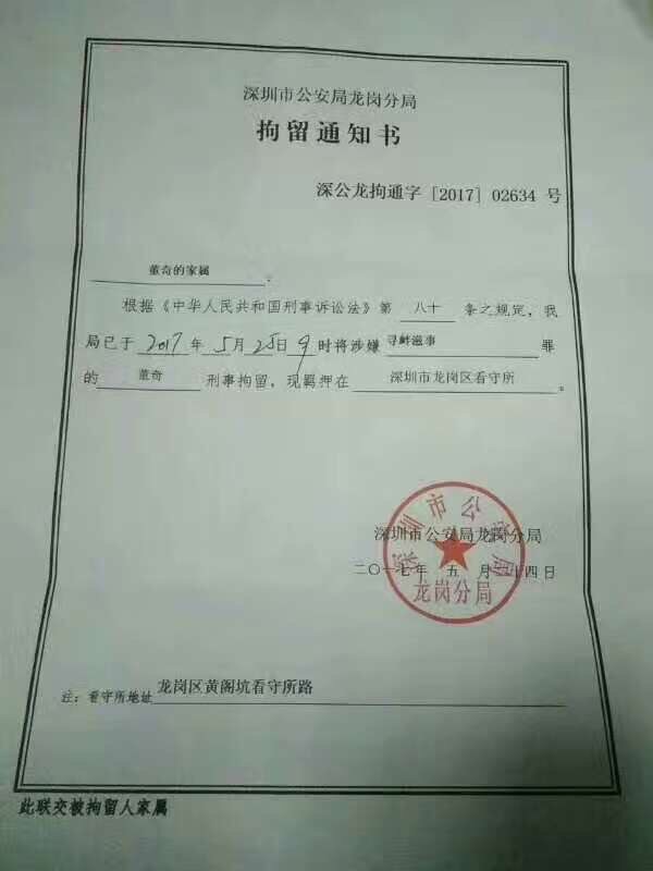 据悉,董奇刑拘罪名为“寻衅滋事罪”,羁押于龙岗区看守所,截止目前,辩护人闻宇律师已经会见了三次。律师称本案已于6月23日送到龙岗区检察院批准逮捕,董奇妻子于昨日收到批捕通知书。