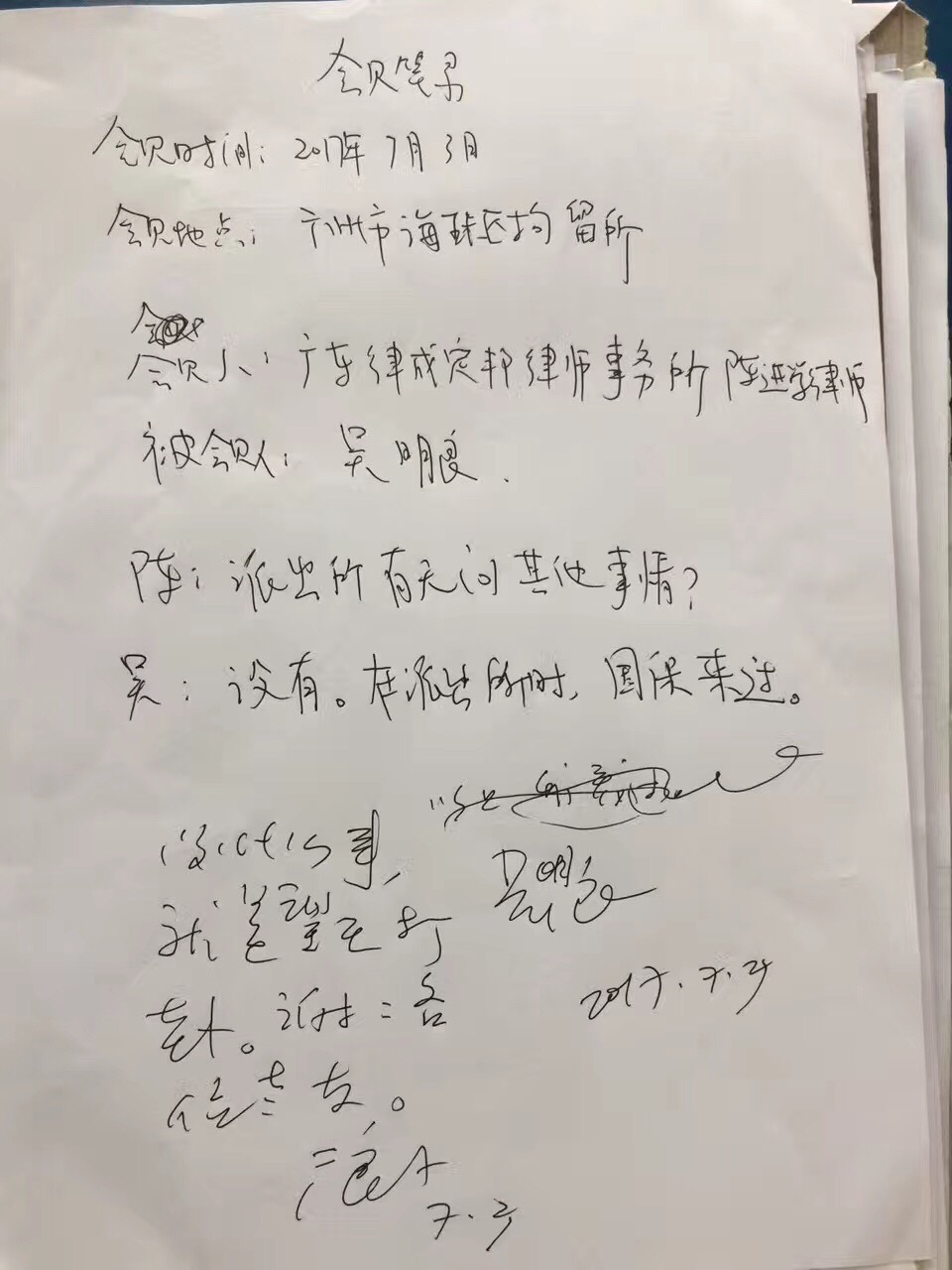 据悉,当时华洲派出所以“毁坏警用单车”的罪名对吴明良进行传唤。吴明良传唤八小时后,陈进学、付爱玲律师前去要求会见,当班警员态度恶劣予以拒绝,并称需要查验核实律师身份。当晚十一点多,吴明良被派出所警车带走,送往海珠区拘留所。