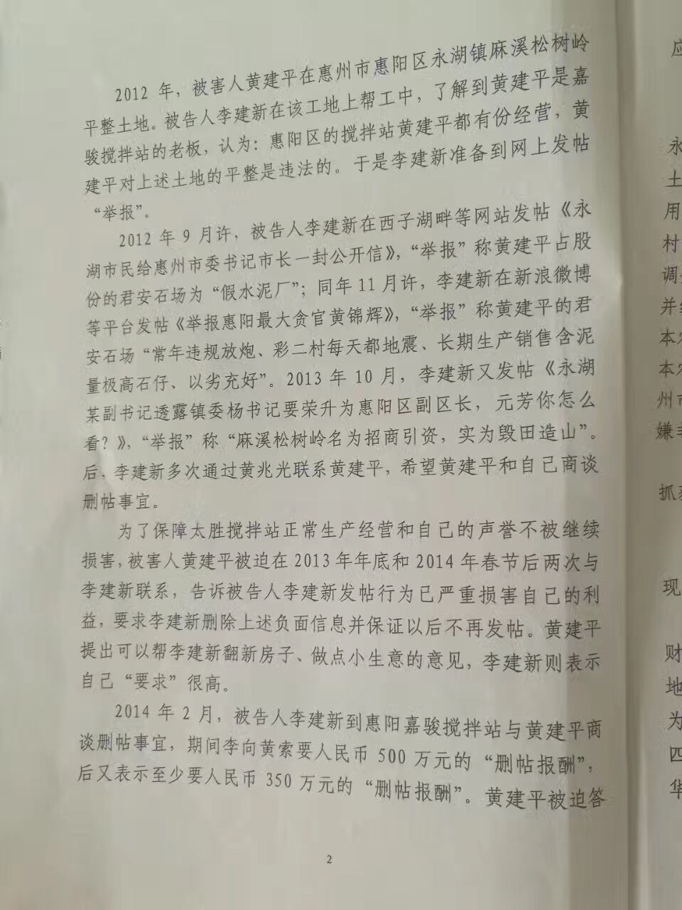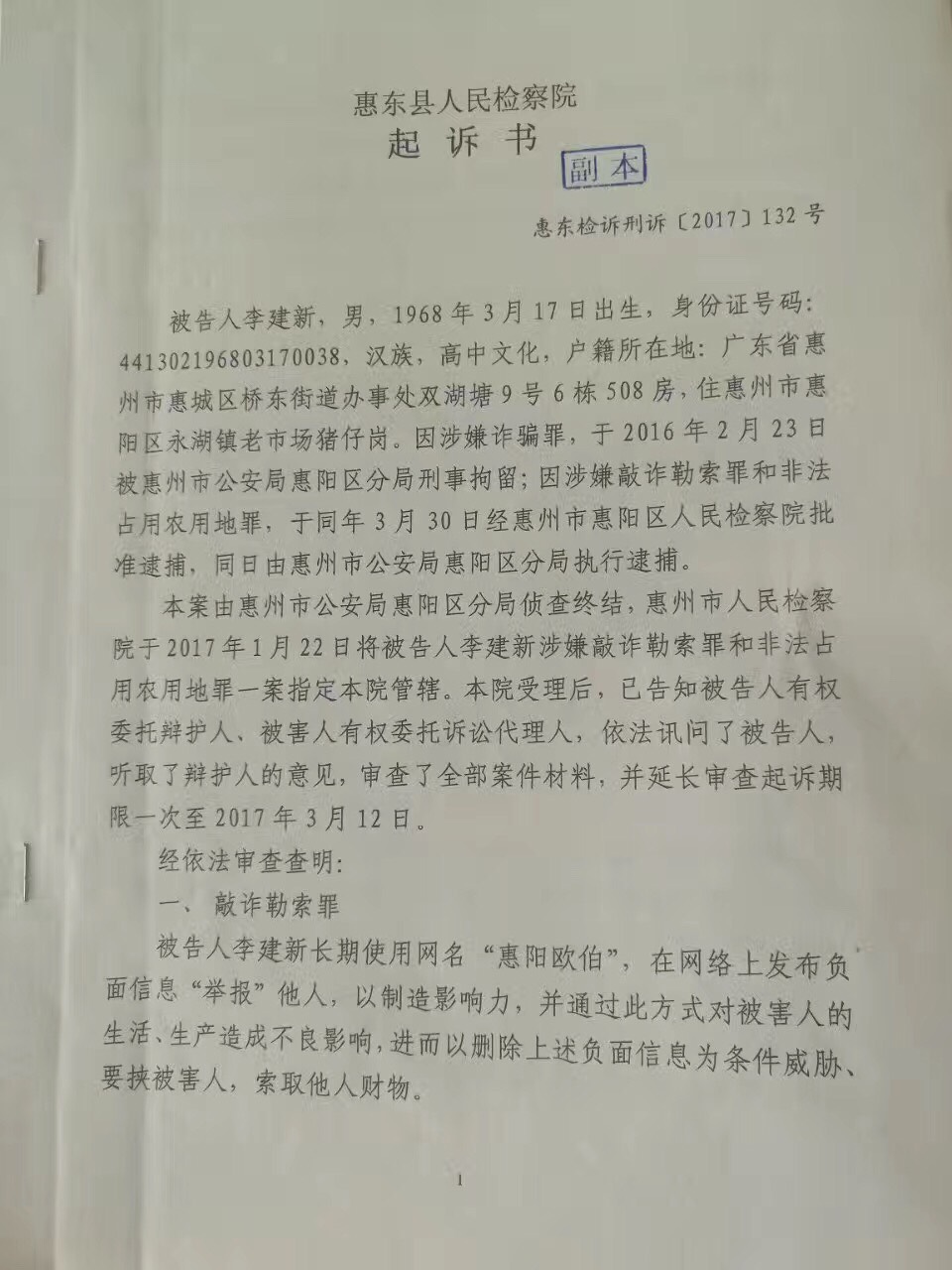 据蔺其磊律师介绍,李健新是广东惠州市惠阳区永湖镇人,1968年出生,网名@惠阳区伯,因实名举报原惠州市副市长黄锦辉而受到网友关注。2016年3月31日,惠州警方以其涉嫌“敲诈勒索”和“非法占用耕田”两罪将其刑拘,该案经过惠州市惠阳区检察院退回补充侦查两次,延长审查起诉期限两次后,于2016年11月24日起诉至惠州市惠阳区法院。惠阳区法院于2017年1月19日发出通知书,告知经惠州市中级法院决定该案由惠东县法院管辖,随后将案件退回到惠阳区检察院,由检察院移送到惠东县检察院再一次审查起诉。惠东县检察院以“惠东检诉刑诉【2017】132号”起诉书于2017年3月8日起诉到惠东县法院,法院定于7月20日上午在该院开庭审理该案。