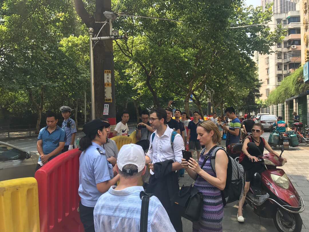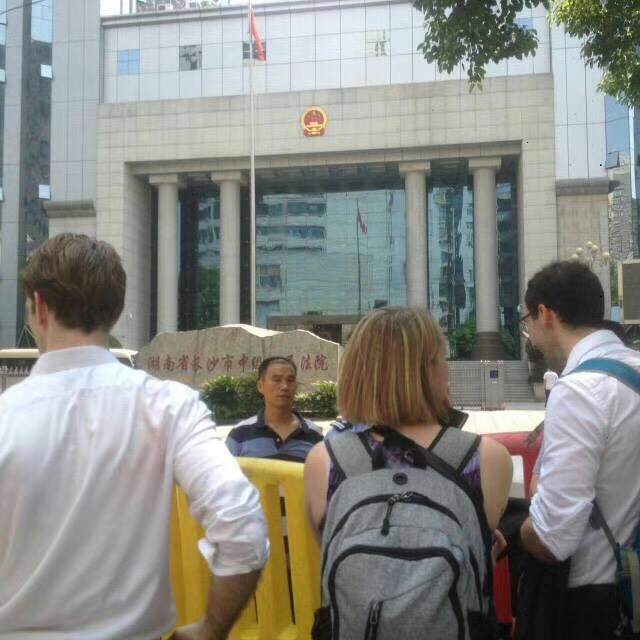 多国使领馆的六名人权官员于八点多到达长沙中院,被告知不得入内旁听,几经交涉,美国驻华使馆人权官员获准前往酒店会议室观看官方直播,其他国家的人权官员以及多家外媒记者被拦在警方设置的水马之外。
