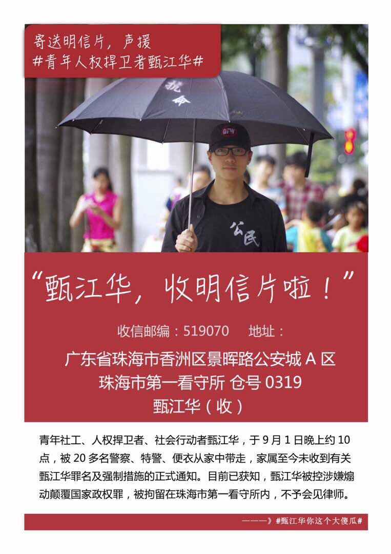 【民生观察2017年9月7日消息】本网获悉,日前有律师前去珠海准备会见甄江华,被告知不予会见,家属也至今未收到任何文书或通知。网友发起“一人一明信片”活动关注声援甄江华。