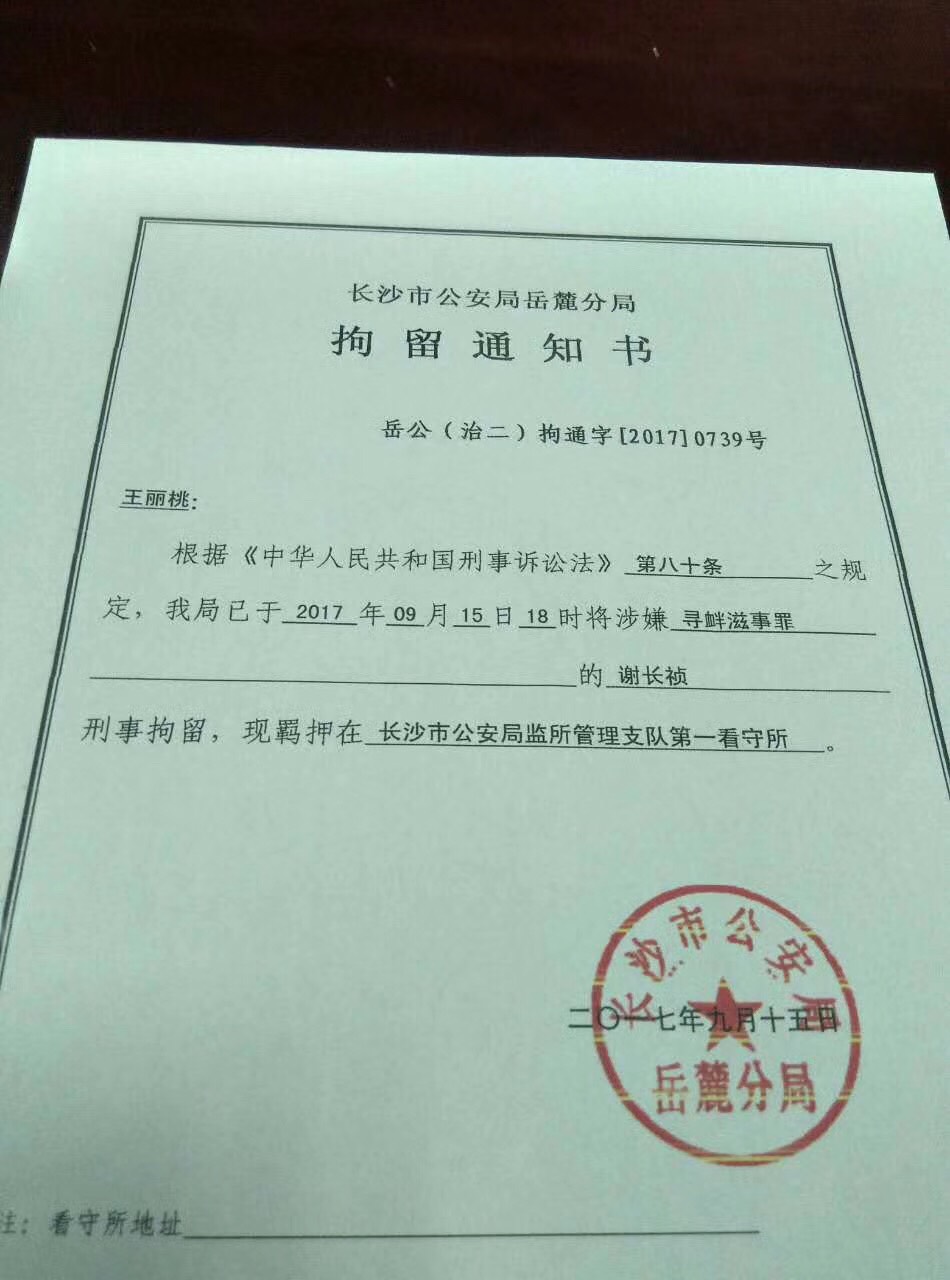 据家属透露,前日(9月14日)上午,谢长祯在家时接获平塘派出所打来的电话,要其前往该所取回一串钥匙(家属称未知什么钥匙)。家属见谢长祯出门后一直未回,于下午五点拨打电话时发现已经关机。昨日(9月15日)上午,家属在多位谢长祯好友的陪同下去到平塘派出所询问谢长祯去向,被告知所长不在无法答复。直到下午三点,该所长返回后并未回答家属的询问,只是拿出一份《刑事拘留通知书》叫家属签字,才得知谢长祯已被以“寻衅滋事罪”刑事拘留。