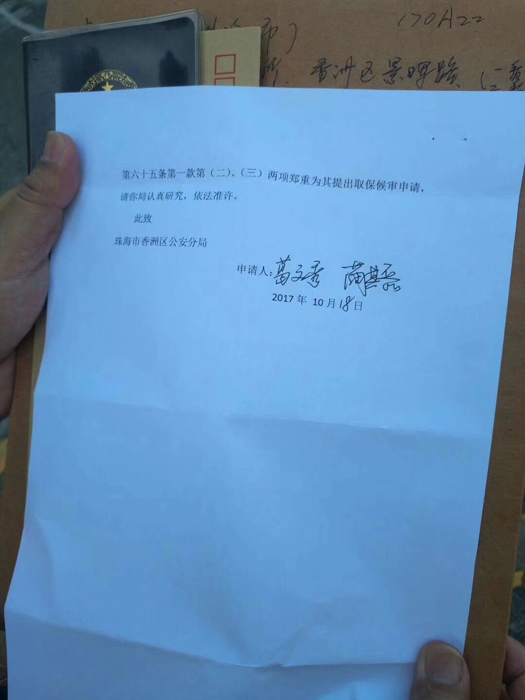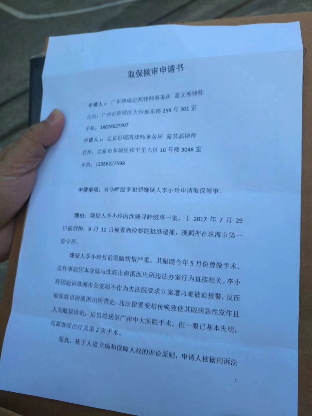 蔺其磊律师表示,鉴于李小玲的身体健康堪忧,多处病患需要诊治,再加上李小玲一直声称“这是珠海警方对我控告他们(警方)的打击报复”,两位律师向珠海市公安局香洲区分局提出”取保候审申请书”,并依法向珠海市香洲区检察院提出“侦查监督申请书”,以期在法律规定框架内给该案带来一定保障。