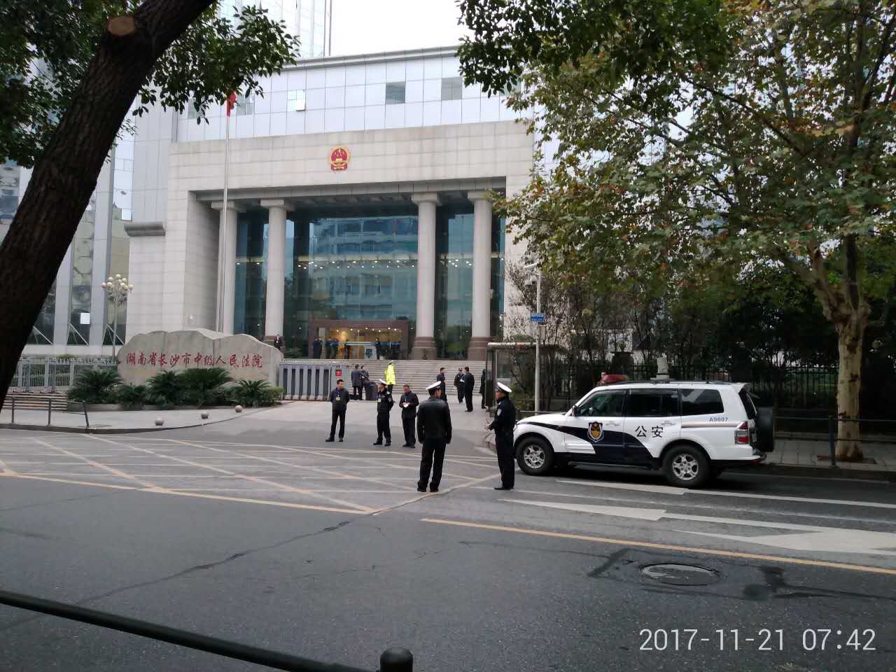 据身在现场的周先生讲述,交通部门一早已将长沙中院周边一公里的路段实行交通管制,马路中间放置水马设置障碍,来往车辆只能绕道通行,中院路段只留下人行通道可以通行,周边密布便衣警察,对过往行人进行仔细甄别。周先生称其有在距离中院大门三百米的路段碰到相熟的国保大队负责人,对方多次勒令其快速离开,并叫人跟踪周先生,不准他前往中院。