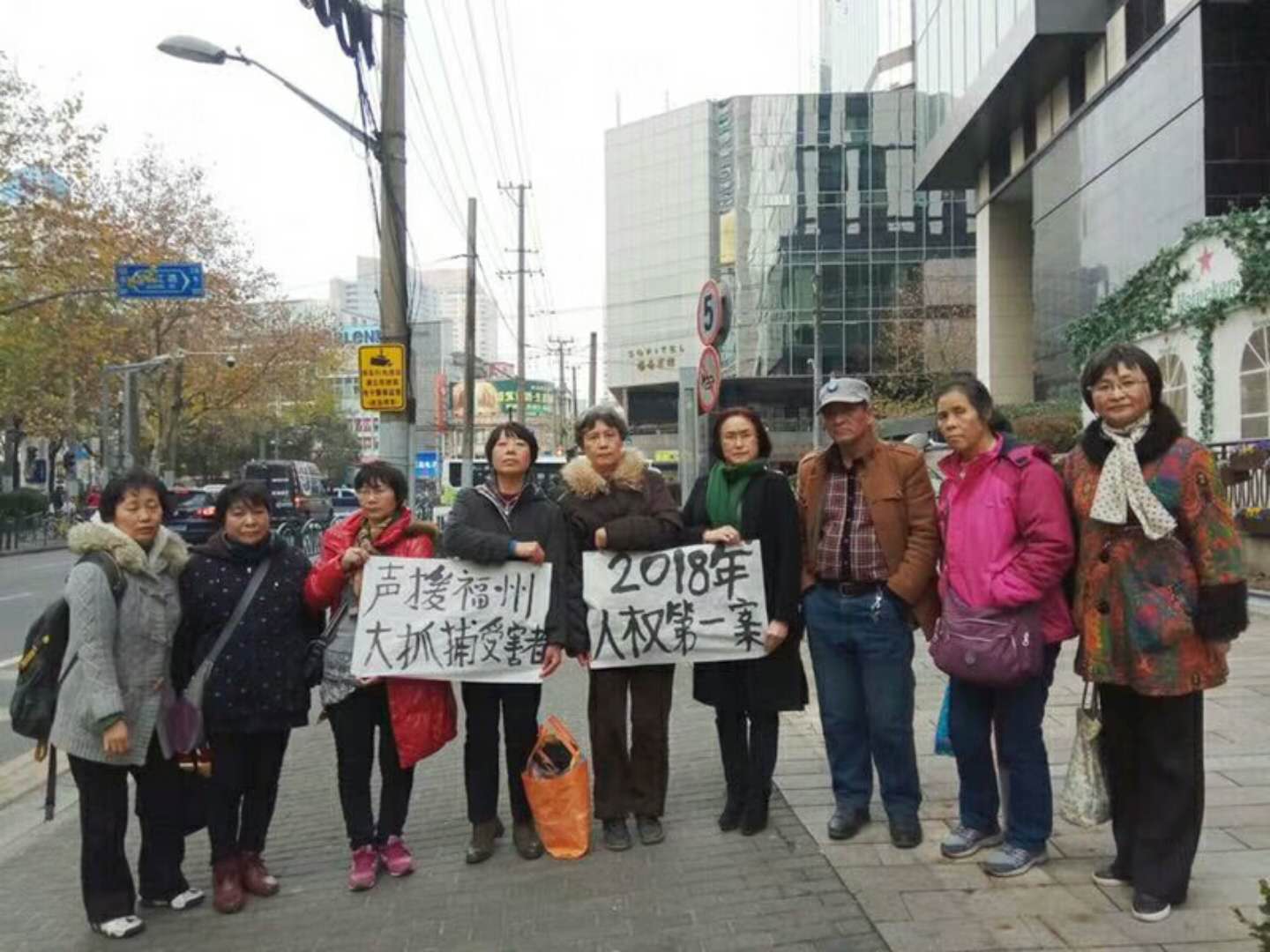 今天是庭审的第一天,法院仅给予每名被告人两个旁听名额,由于旁听证严重不足,未取得旁听证的维权人士们,就只好滞留在法院门外予以声援。这些声援人士他们整齐的排列在法院门前,手举“声援福州大抓捕受害人”、“2018年人权第一案”、“伸冤无罪”、“释放冤民”、“停止迫害”、“呼唤正义”、“呼唤良知”等标语,向过往路人宣传福建当局在迫害维权公民,并向福建政府和福清法院表达自己的愤慨及抗议。