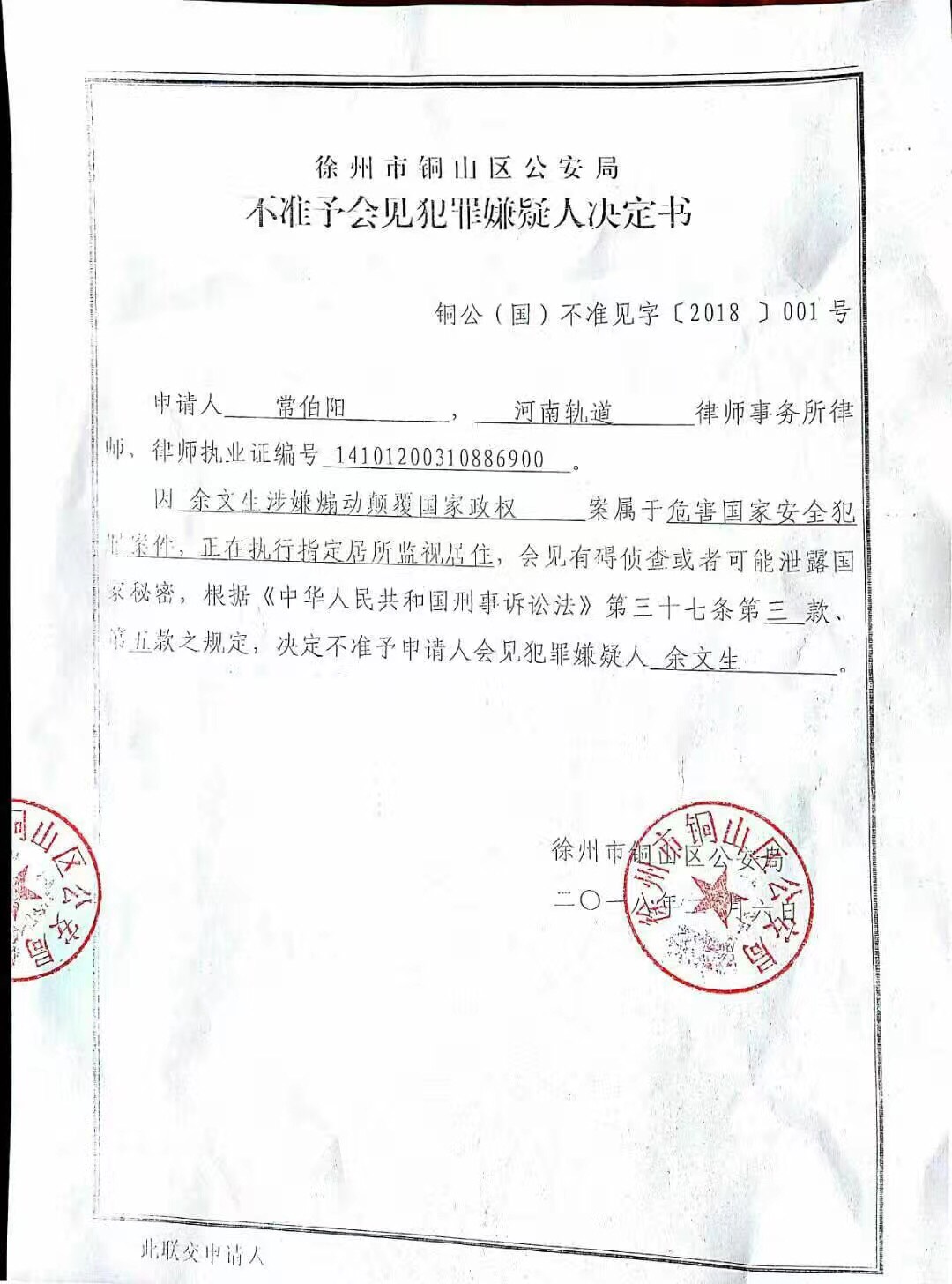 【民生观察2018年2月9日消息】本网获悉,余文生案辩护人河南郑州常伯阳律师于昨天(2月8日)收到江苏徐州市公安局铜山区分局的《不准予会见犯罪嫌疑人决定书》,当局以会见有碍侦查或可能泄露国家秘密为由,驳回了律师的会见申请。另外,余文生律师的家属继续受到当局的滋扰,令其妻许艳女士不胜厌烦。