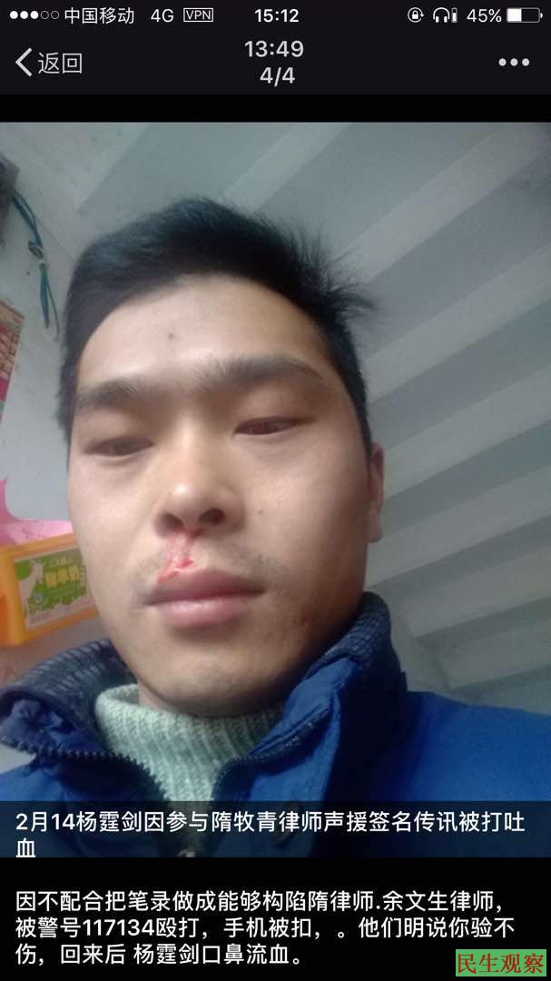 民生观察2018年2月14日消息:今天(2月14日)江西维权人士杨霆剑(本名杨微)因签名声援被吊照律师隋穆青被当局传唤,传唤期间诱供杨霆剑构陷隋律师被其识破而遭毒打至鼻口流血、筛板骨折。