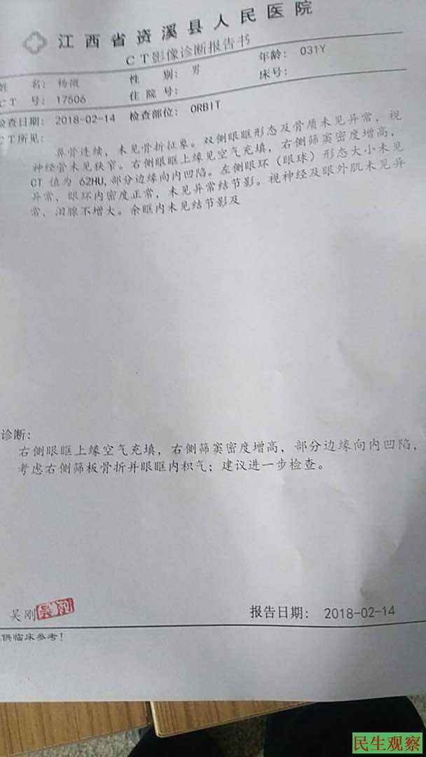 据悉,今天(2月14日)上午大约十点多,江西维权人士杨霆剑遭本地资溪县公安局三名便衣国保警察上门传唤,在杨霆剑的要求下向他出示了警官证。随即,便衣国保警察便将杨霆剑带到县公安局办案区审讯室,国保问杨霆剑为什么要签名声援隋穆青和余文生,杨霆剑说“因为隋穆青律师做的都是维护当事合法权益的好律师”。当国保警察示意杨霆剑是“隋穆青律师自己发起的签名活动”,并让他在笔录上签名时,被杨霆剑识破其在诱供构陷隋律师,杨霆剑当即拒绝在这样的笔录上签名。看到构陷隋律师的目的没有达到,审讯警察恼羞成怒,一名警号117134的年轻警员对杨霆剑赤裸裸的恐吓说“我不仅精通审讯,还学过军体拳”。话音未落便出拳打在了杨霆剑的脸上,连击十几拳,直至将杨霆剑打得鼻口喷血,完全不避讳审讯室墙上的摄像头。