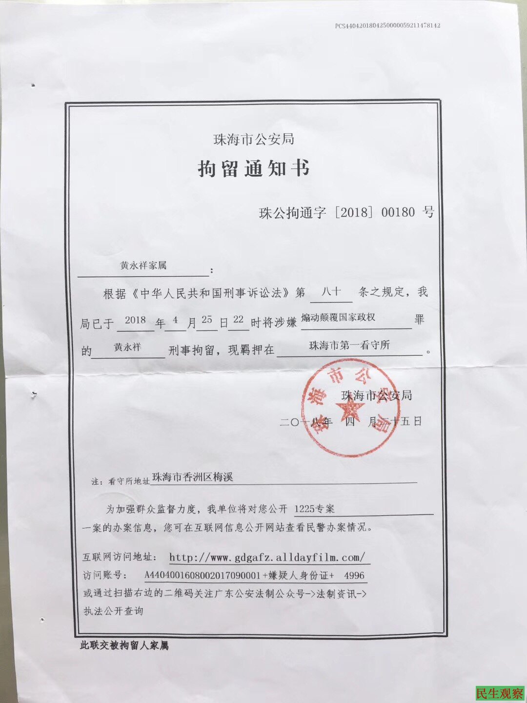 【民生观察2018年5月10日消息】今日,黄永祥妻子刘亚杰女士收到珠海市公安局寄来的《拘留通知书》,黄永祥的罪名为“煽动颠覆国家政权罪”,通知书附带互联网网站查询链接。网站信息显示,黄永祥与甄江华同案,命名为“1225专案”。