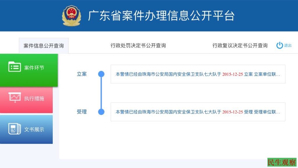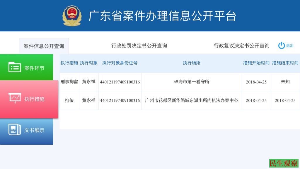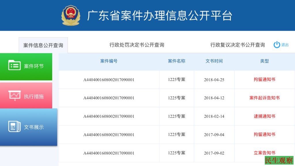 根据警方提供的网站链接,家属进入“广东省案件办理信息公开平台”,得知“1225专案”早在2015年12月25日已经立案,并已于2018年4月12日移送珠海市检察院审查起诉。网站信息同时显示,早前(2017年9月2日)被以“煽动颠覆国家政权罪”抓捕的甄江华目前被羁押在珠海市第二看守所。