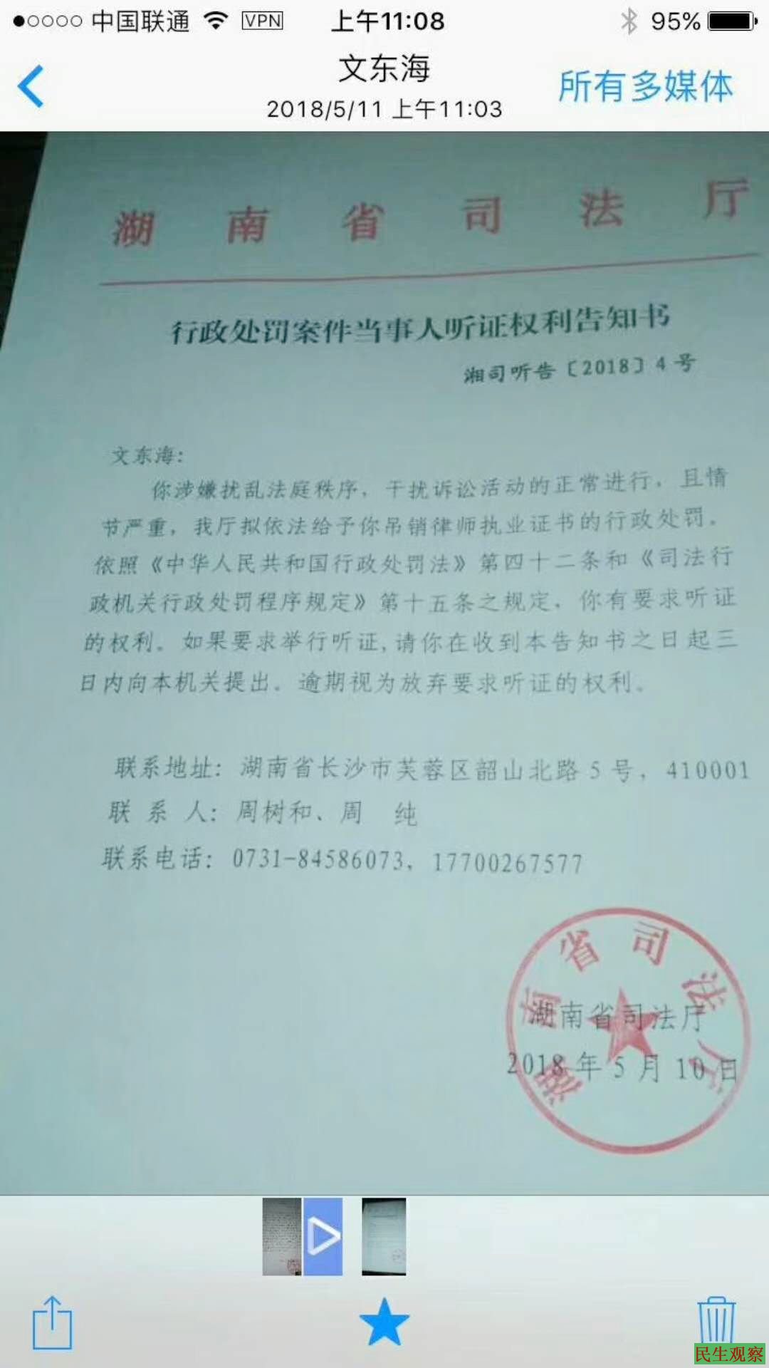 【民生观察2018年5月11日消息】本网获悉,湖南维权律师文东海,于昨日收到湖南司法厅送达的拟吊销律师执业证书的听证通知。
