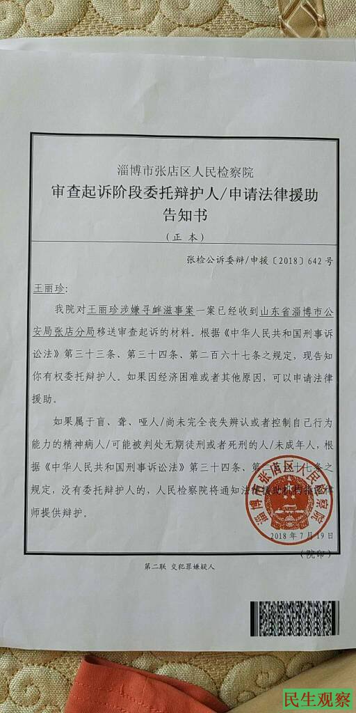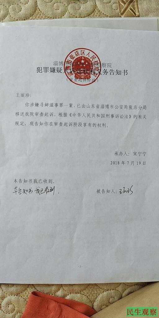然而,时隔不到一年,在其取保候审即将到期的时刻,上周五(7月19日),王丽珍又接到了来自于山东淄博张店区公安局电话,被告知其2017年8月23日“寻衅滋事”取保候审一案,现已被移交至张店区检察院审查起诉。