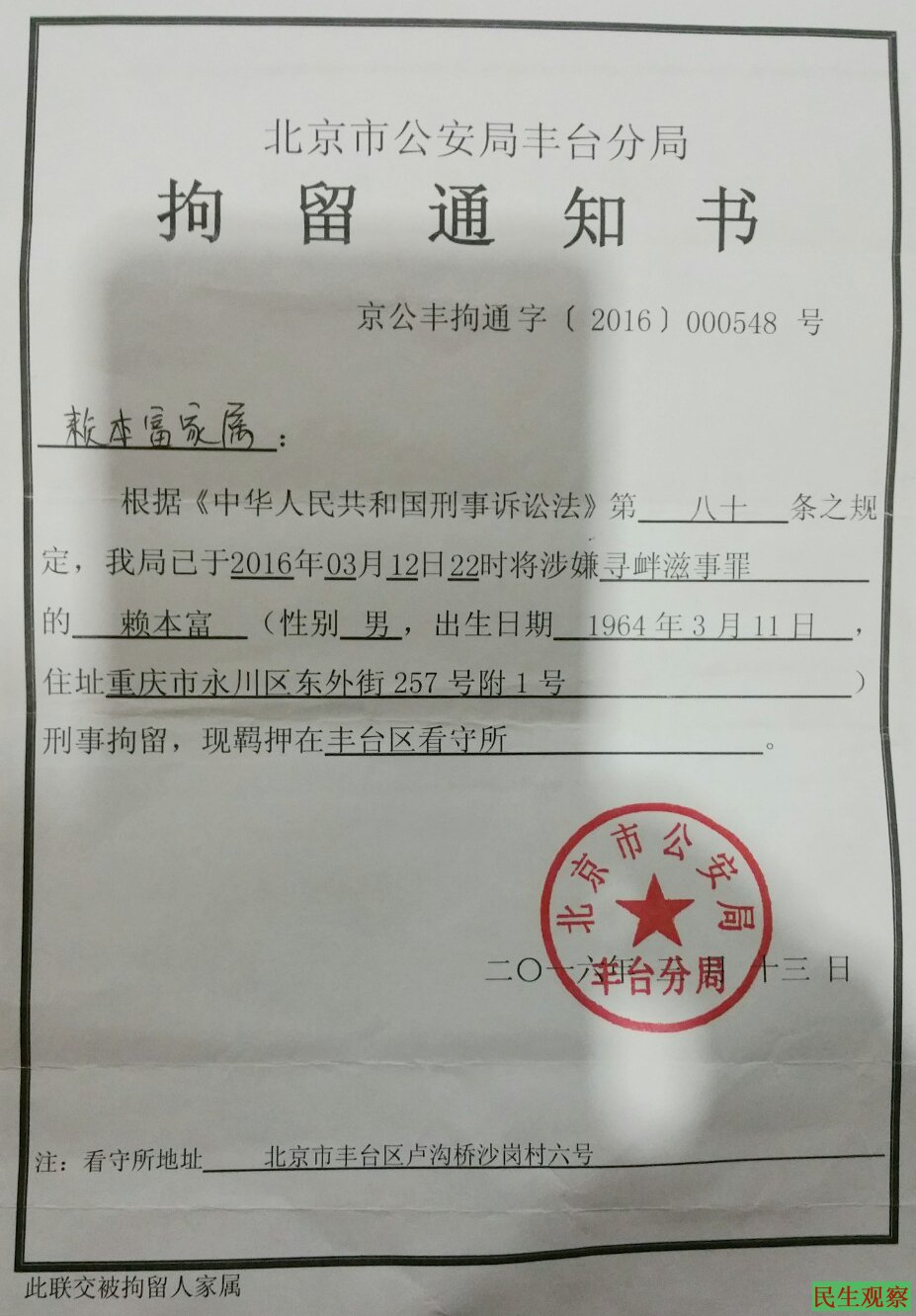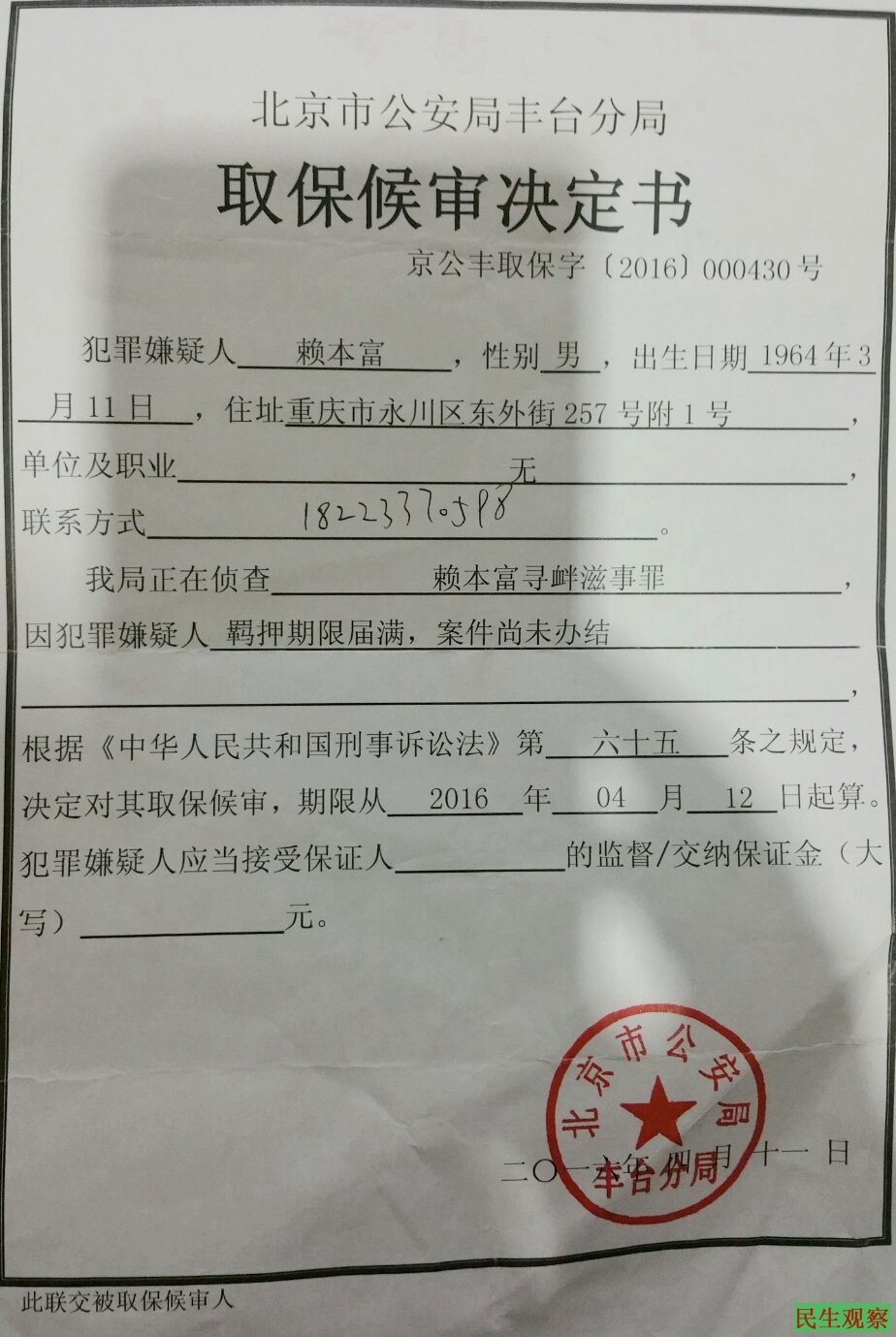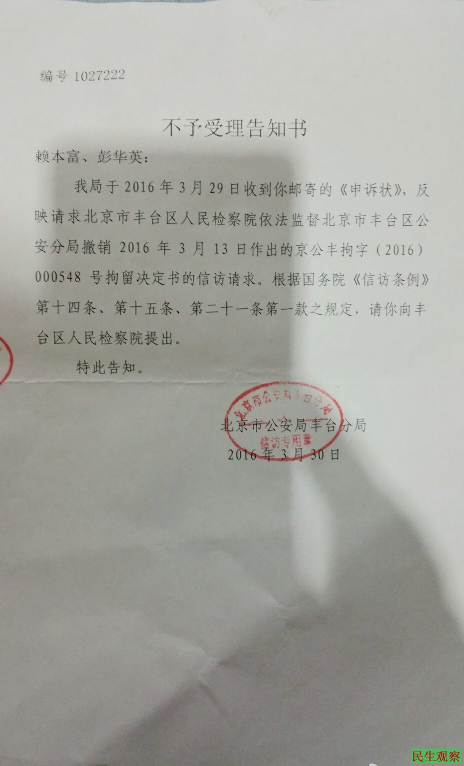 赖本富表示,他在北京正常信访,没有任何违法行为,却被北京丰台公安局送看守所无辜关押30天。试问:公民的人权在哪里?依法治国在哪里?