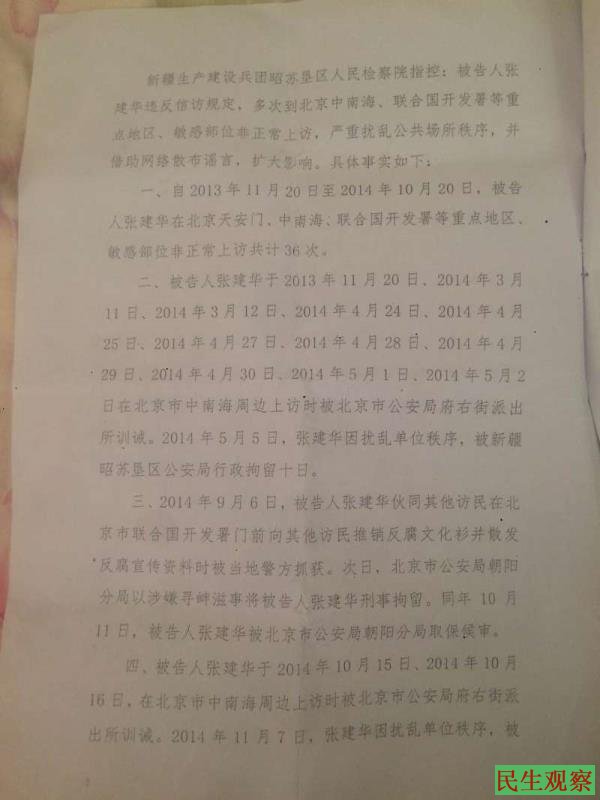 张建华因为承包土地买了假农药后造成颗粒无收,通过打官司而走上维权道路,在北京认识了江西的访民朱玉芳,还有新疆的访民李建筑,张建华在北京维权中与李建筑,朱玉芳等朋友一起在北京发放访民文化衫,文化衫前面印有《没有腐败就没有访民》,后面印有《支持习,李,王反腐》字样,张建华,李建筑,朱玉芳他们三人经常在北京信访局及北京南站等地发放访民文化衫,他们在北京南站还认识了其他重多访民,她们三个人就随其他访民一起去上访,他们经常在北京亮马河联合国住中国大使馆附近发放访民文化衫,北京亮马河附近各国大使馆都设在哪里,亮马河附近每天都有很多访民在使馆区上访,因此她们三人被亮马河附近的警察收缴了访民文化衫,并且将她们三人都刑事拘留,因为上访张建华多次被非法拘留,李建筑已经失联好几年了目前下落不明,朱玉芳因此维权上访被江西当地判刑三年多,朱玉芳目前已经刑满出狱。