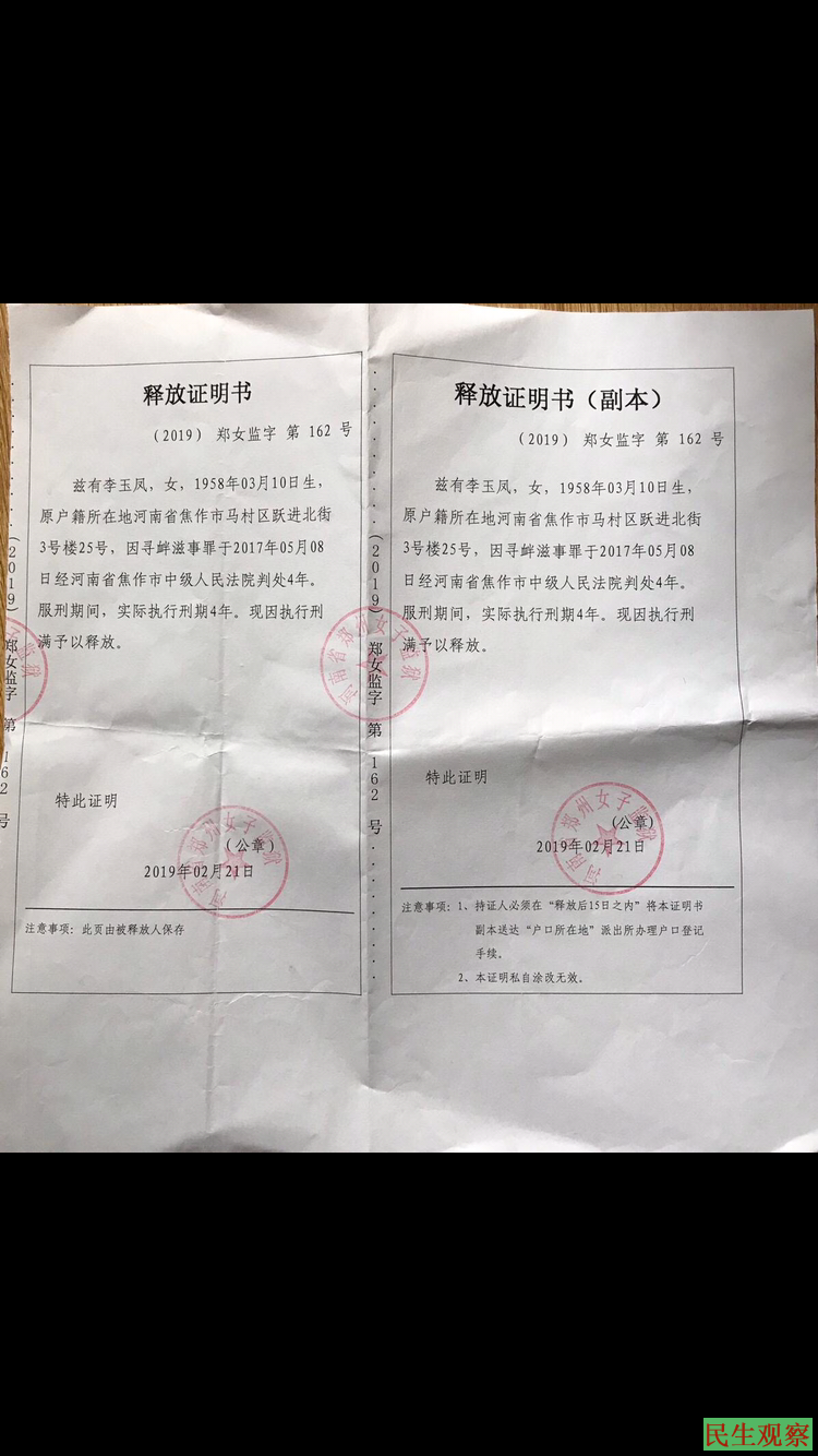 据李玉凤妹妹李白凤称,昨天除了亲朋前来河南迎接姐姐李玉凤,焦作当地着便装的三名公安也开警车来到了“郑州女子监狱”,欲控制即将出狱的李玉凤,缘于看到前来迎接姐姐的人多无法下手强行控制,才极不情愿的作罢。但焦作公安却打开了执法仪偷偷跟踪拍摄前去迎接李玉凤的朋友。
