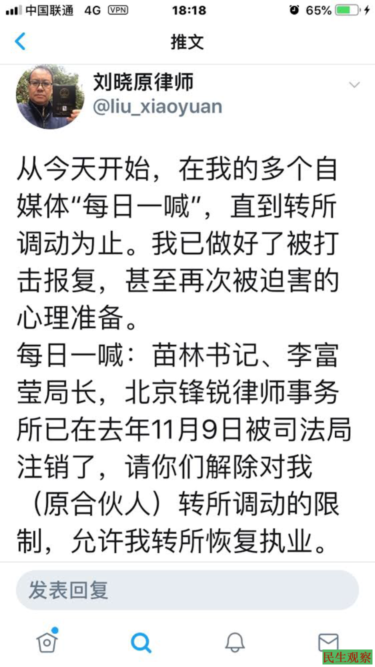 刘晓原律师表示,关于转所调动的问题已经长时间作出努力,并多次到司法局反映情况以及沟通,同时亦致信相关负责人进行求助,但收效了无。眼见五月期限将至,个人工作及前途将会随着律师执业证书的自然吊销而陷入困境,时日无多迫在眉睫,因此决定将在所有个人自媒体平台进行“每日一喊”,直到当局允许转所调动恢复执业为止。