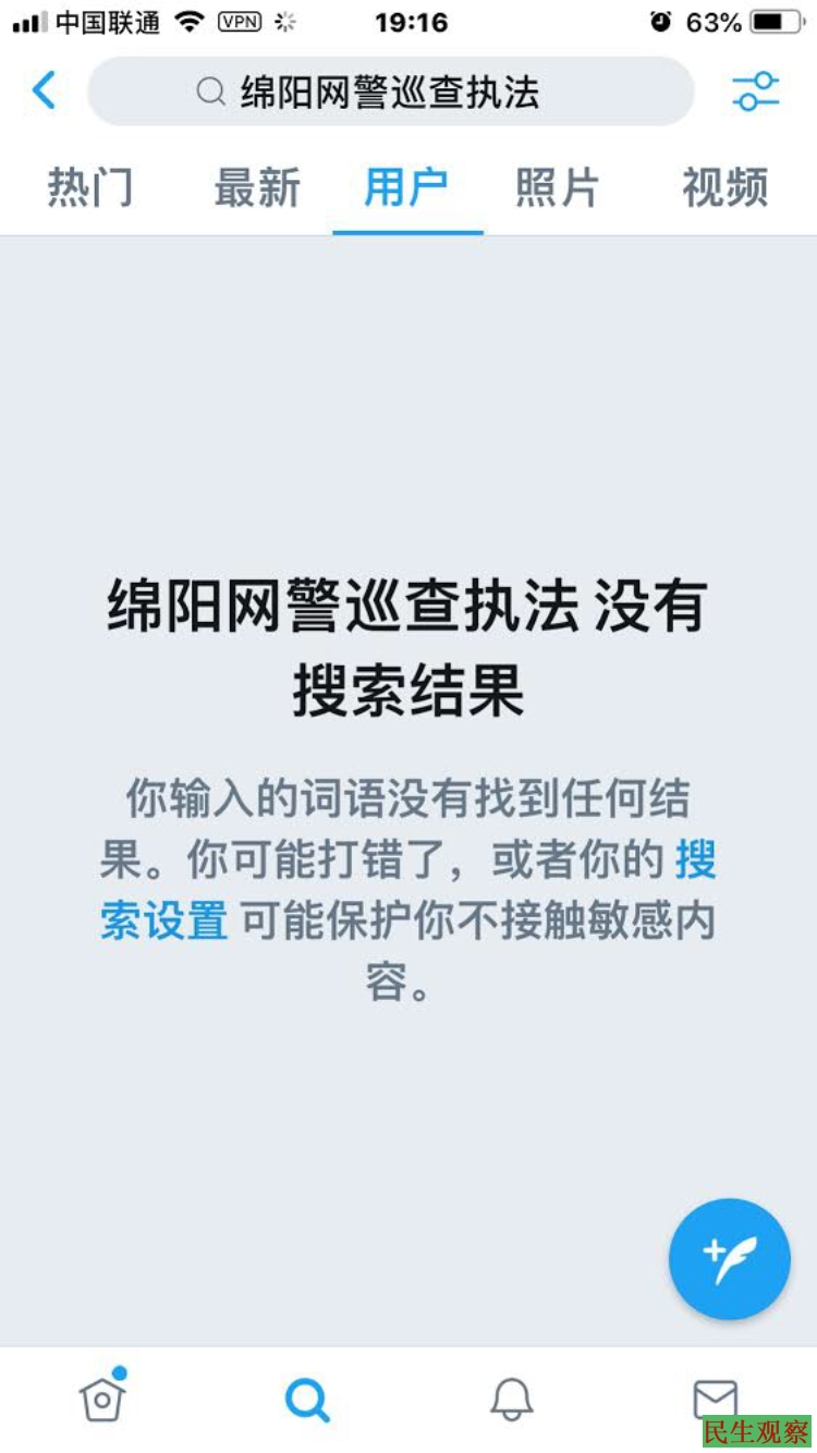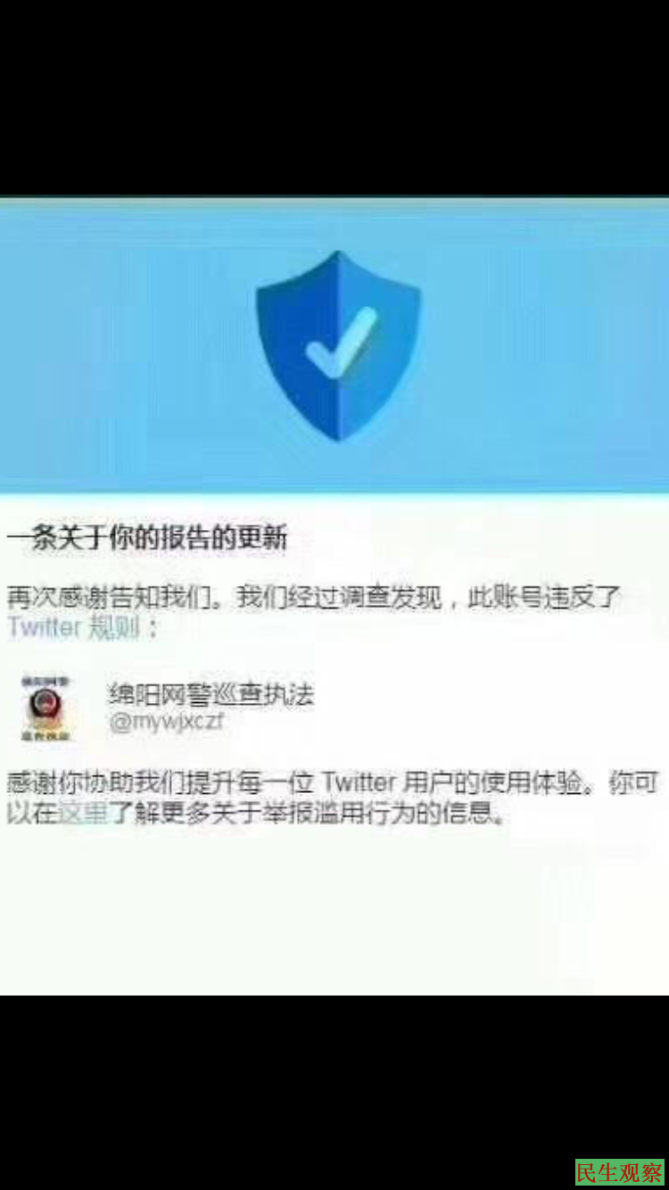 【民生观察2019年3月9日消息】近期,有翻墙网友反映,Twitter推特平台出现一个名为“绵阳网警巡查执法”的推号,该推号公然自称“在推特上进行执法”,近日该号遭众多网友举报,目前该推号已无法显示和搜索。
