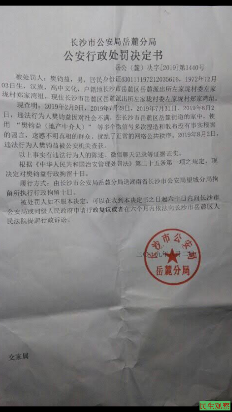 据悉,8月2日上午,樊钧益由辖区派出所的户籍警员带走调查,至当日晚上将其送至长沙望城区拘留所。警方指其“造谣、传谣”,“因对社会不满”,利用多个微信号“捏造和散布没有事实根据的谣言”,“迷惑不明真相的群众”,“扰乱了正常的网络公共秩序”,触犯《治安管理处罚法》,因此对其作出行政拘留十日的决定。