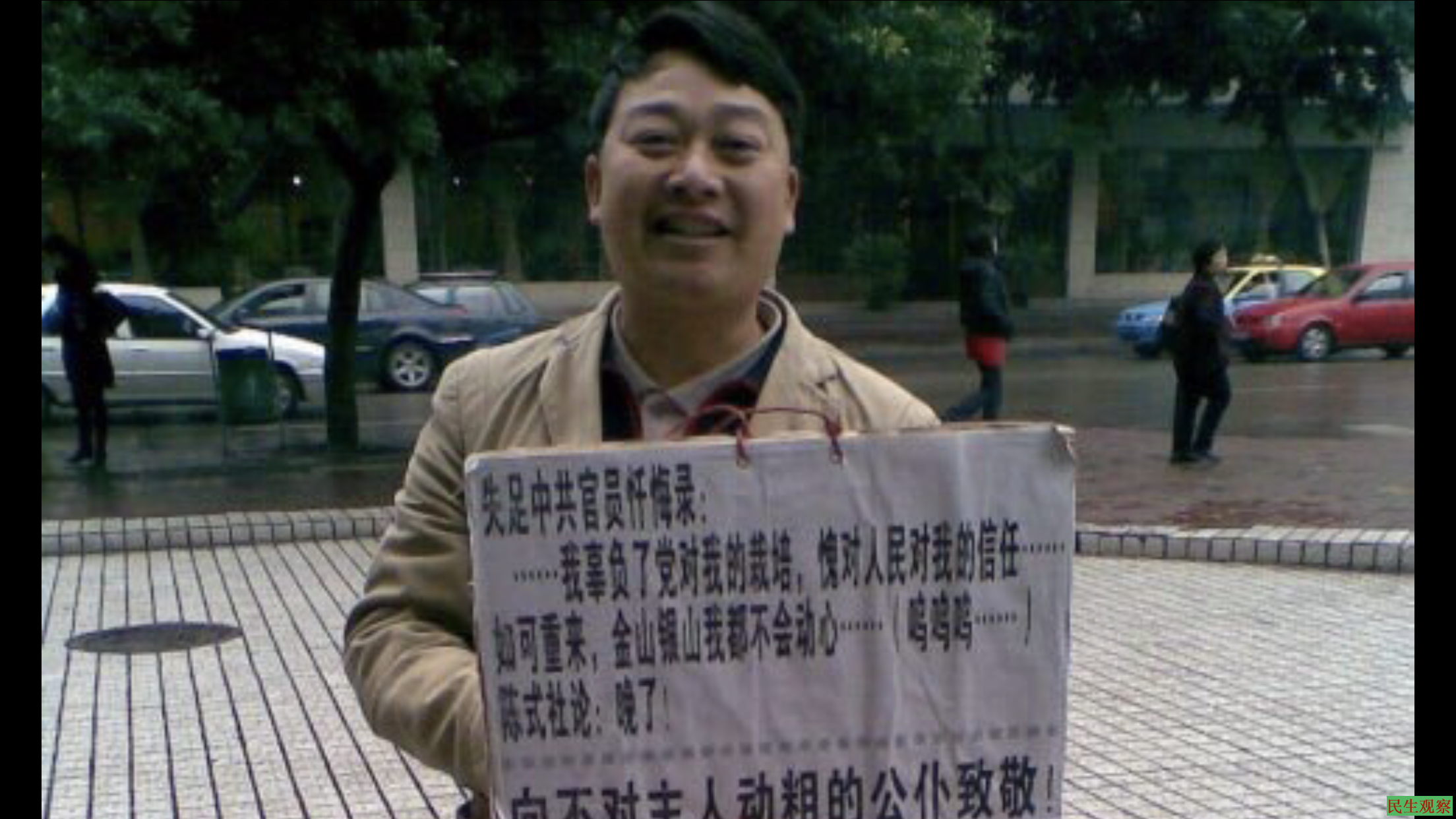 1989年曾参与过“89学运”,六四镇压后返乡谋生,仍坚守民主理念,在当地展开多种帮助访民的维权活动,后因多次试图前往北京祭奠前中共总书记赵紫阳而被成都警方长期监控、威胁;