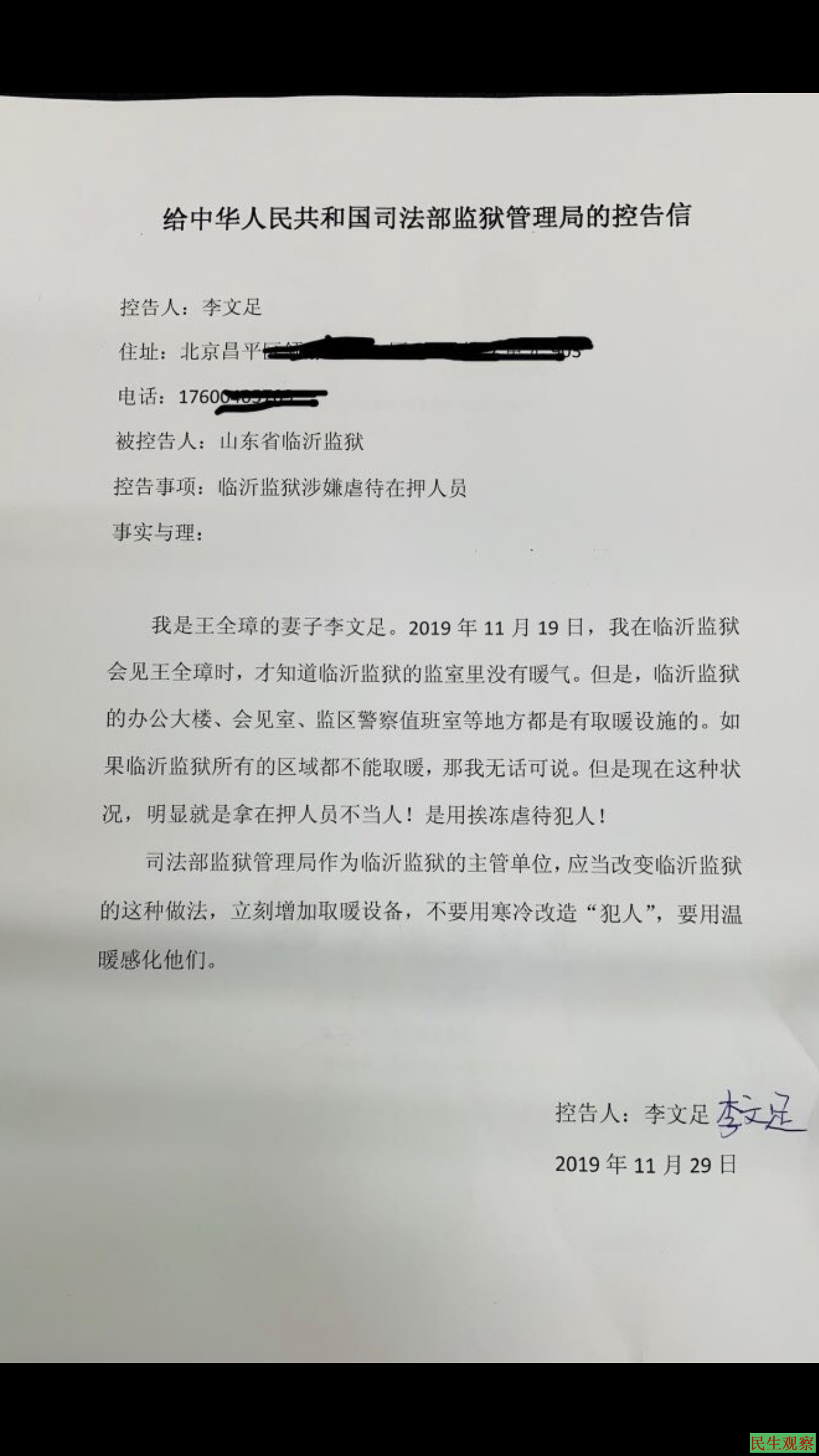 【民生观察2019年11月30日消息】本网获悉,“709”家属李文足致信司法部监狱管理局,就临沂监狱未在监区安装取暖设施的情况向主管监狱事务的司法部监狱管理局提出控告,表示“要用温暖感化他们”。