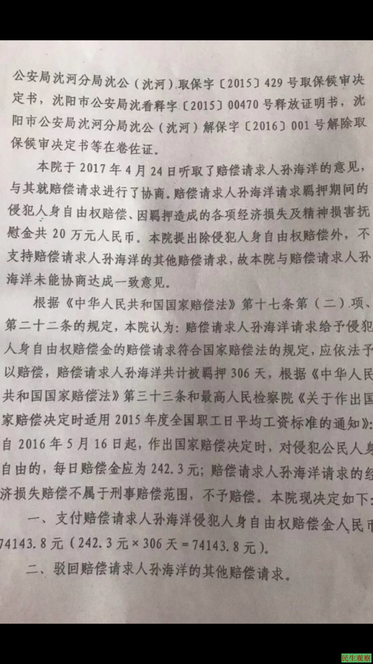 2015年3月19日,沈河区公安分局国保大队给孙海洋办理了取保候审。至此,孙海洋在沈阳市第一看守所里整整被关押长达308天。2017年5月,沈河区检察院给孙海洋平反昭雪,并给予了国家赔偿7万余元。