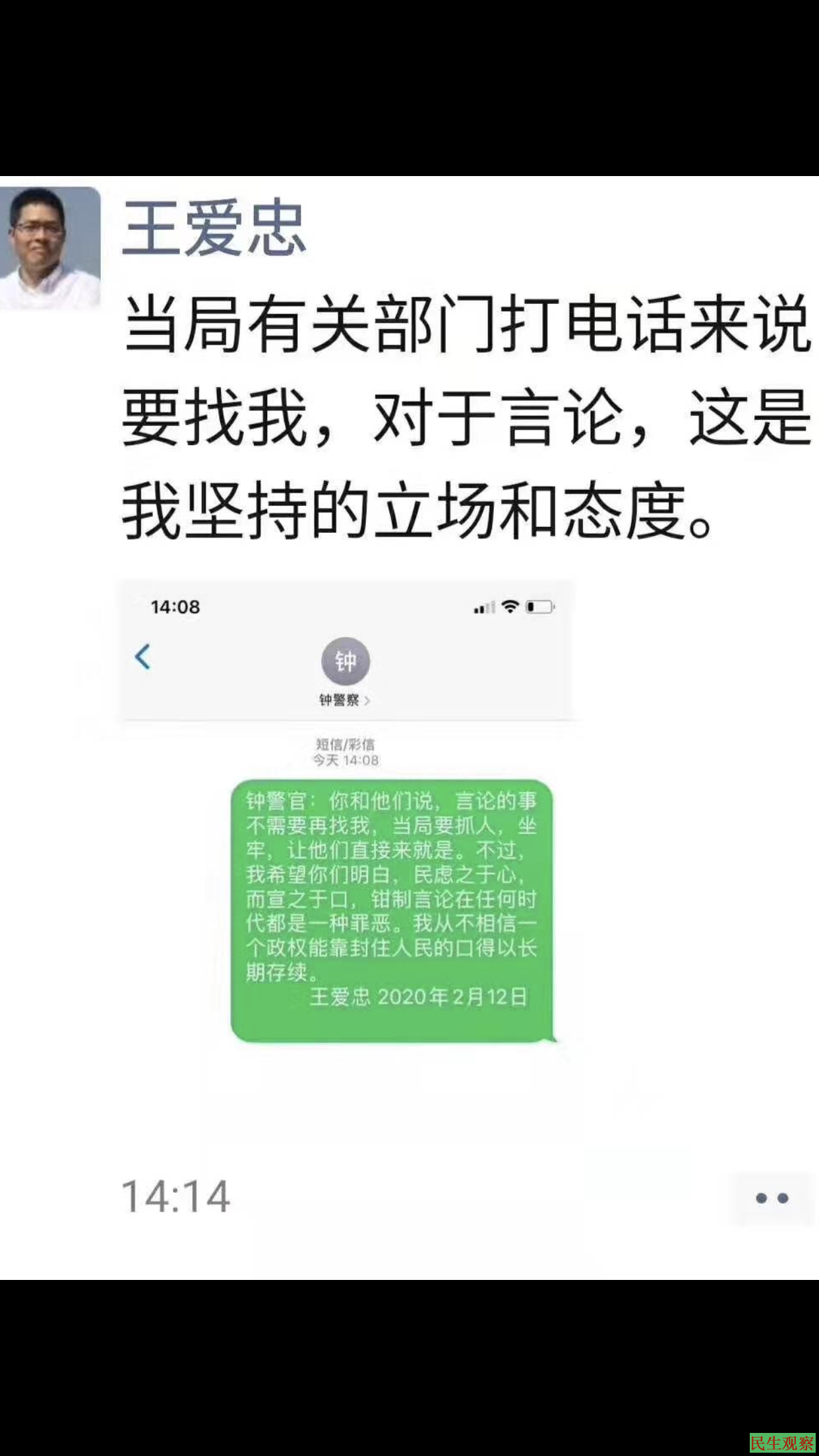 2月12日,广东维权人士王爱忠接到辖区警方电话,要求他注意禁言。王爱忠表示,对于言论,这是我的坚定立场和态度。王爱忠对钟警官说:“言论的事,不要再找我,当局要抓人、要我坐牢,让他们直接来就是。不过,我希望你们明白,民虑之于心,而宣之于口,钳制言论在任何时代都是一种罪恶。我从不相信一个政权能靠封住人民的口而得以长期续存。——王爱忠2020年2月12日”