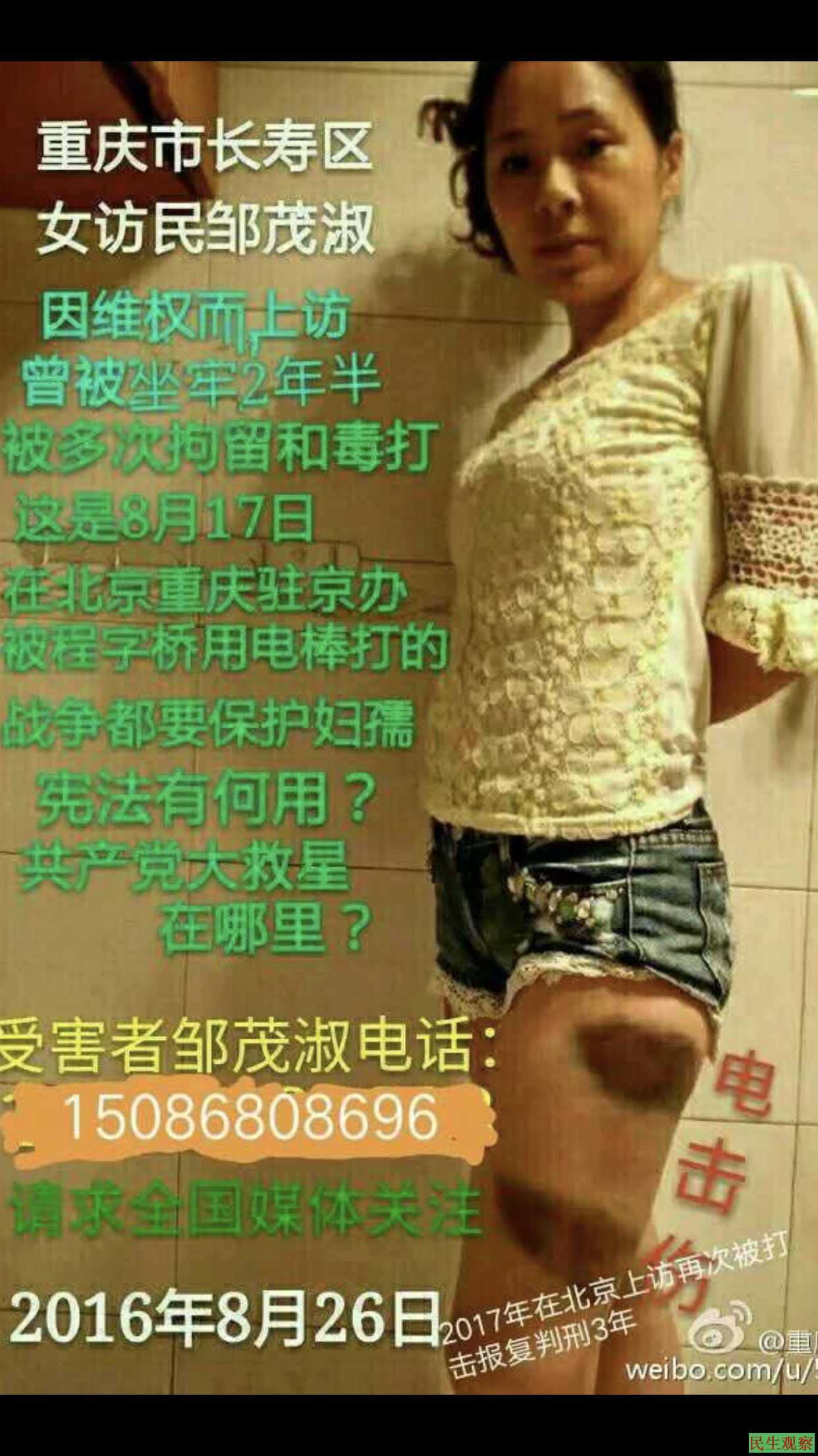 为此,邹茂淑和家人多次向有关部门反映未果,问题不但不解决,2010年邹茂淑反而还被打击报复判刑2年6个月。获释回家后,邹茂淑又层层上访,又多次被拘留和暴力毒打等。2017年邹茂淑和十几名重庆访民,又上北京公开反映问题,再次被打击报复判刑3年。2020年1月11日出狱后,却被重庆公安强行带走控制,至今问题一直未得到合理解决。