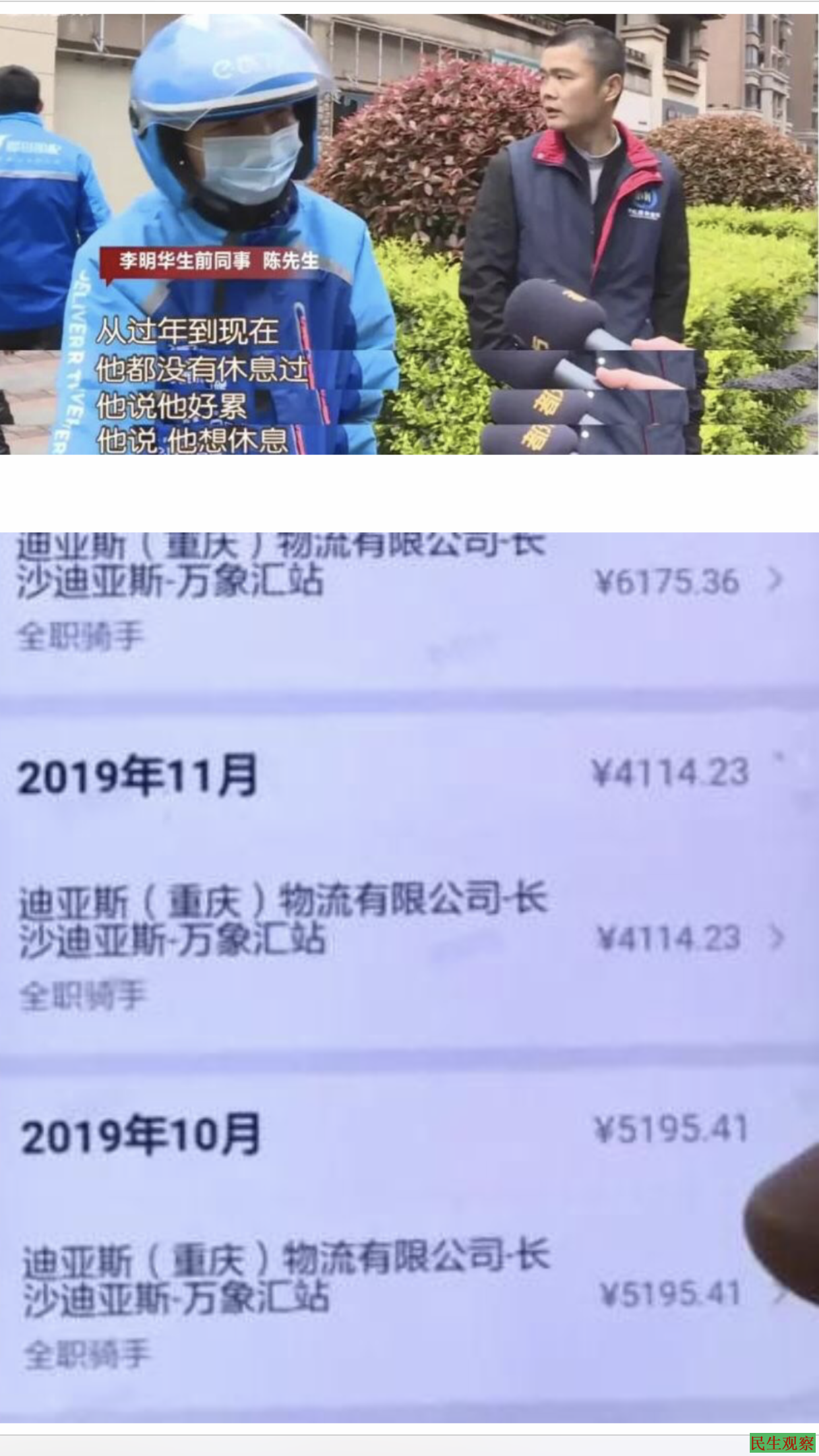 李明华的同事说:“他(李明华)好累,他想休息。从过年一直到现在,他都没有休息过。现在站点不让我们接受媒体采访,怕曝光,怕有些骑手说真话。”
