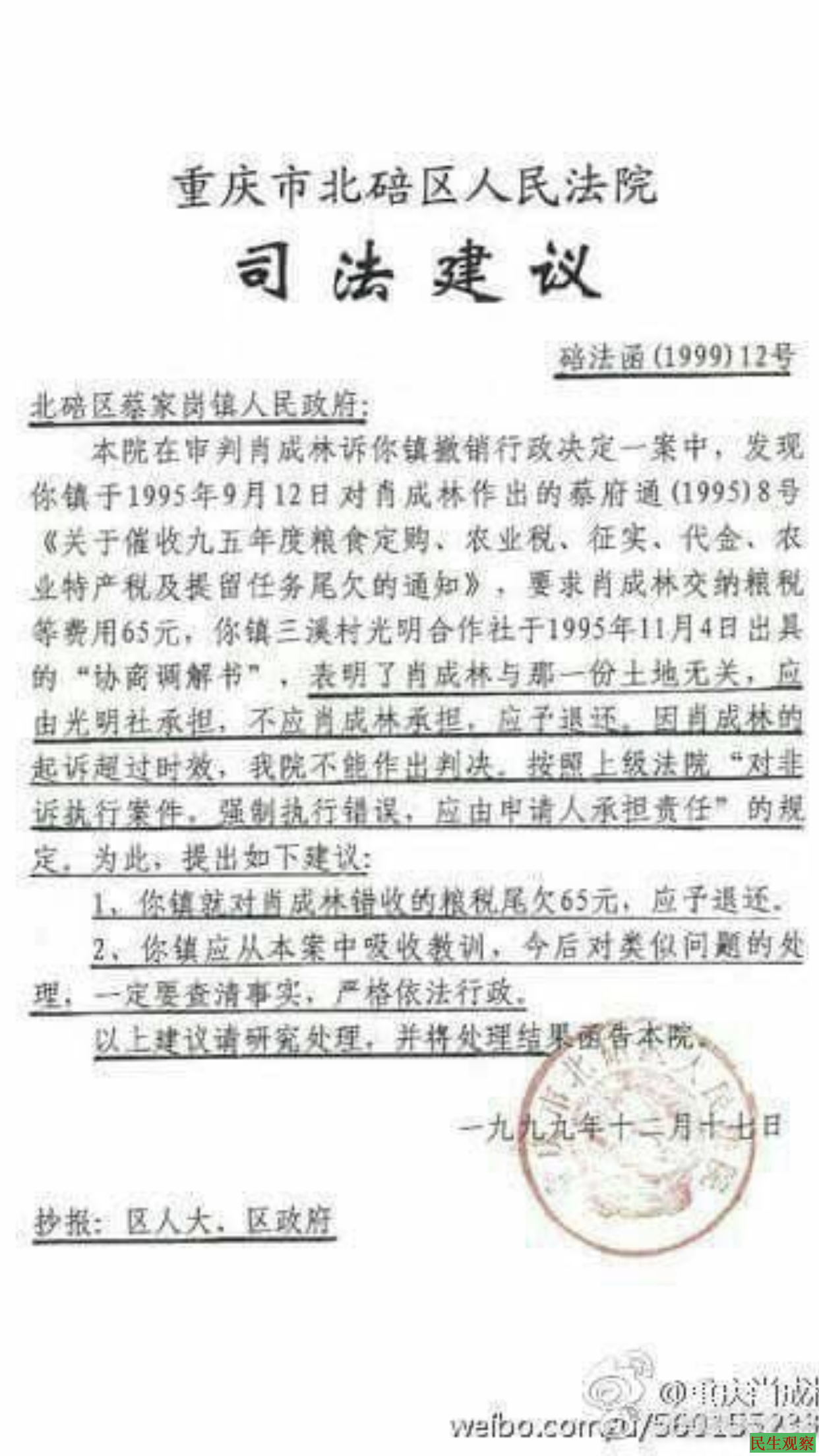 据悉,今年56岁的肖成林,家住重庆市北培区蔡家岗镇三溪村光明社,世代务农。1995年8月间,蔡家镇政府为了充裕库收。把社里一份多年荒废的土地农业税强加在他头上,他不服拒绝缴纳,从此厄运就一直伴随着他。