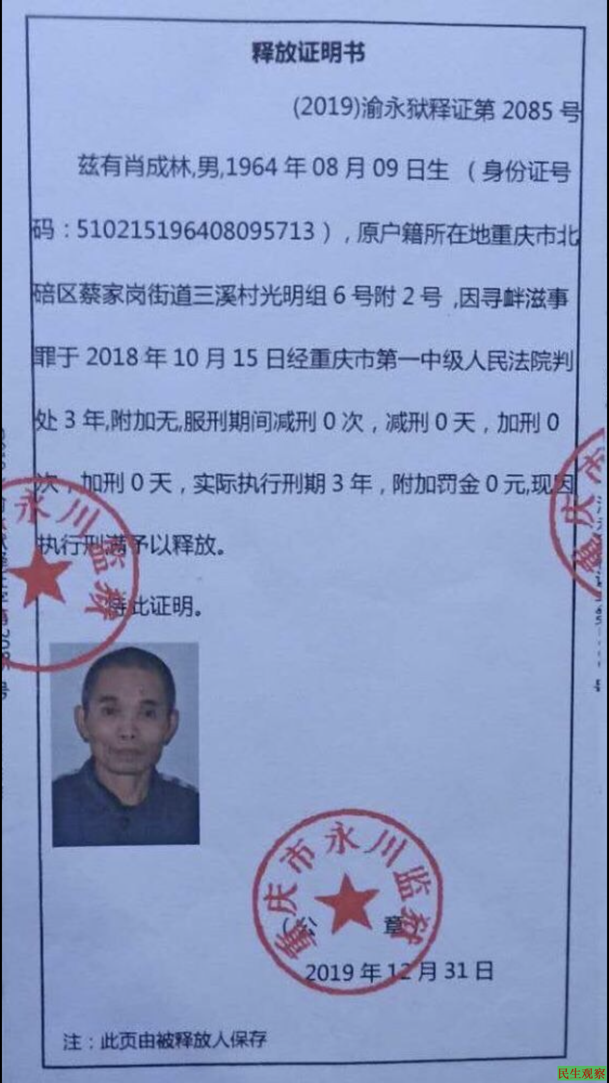 获释后的肖成林继续上访维权,再次被抓。2018年10月15日,肖成林因寻衅滋事罪被重庆市第一中级人民法院判处3年有期徒刑,至2020年1月6日刑满获释。