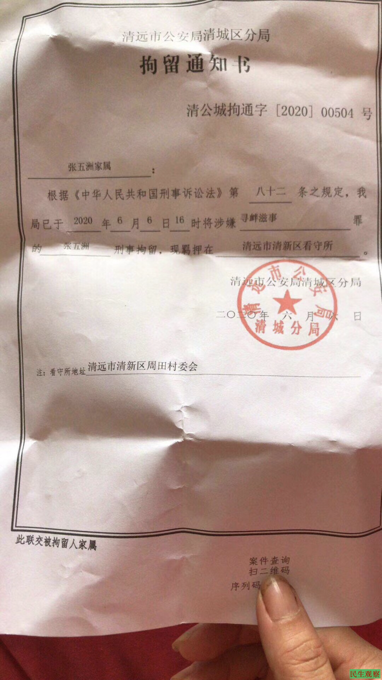 【民生观察2020年6月7日消息】本网获悉,近日,曾被控“危害单位秩序罪”及“寻衅滋事罪”获刑一年零四个月刚于二月才刑满出狱的湖北籍维权人士张五洲再次被警方刑拘,罪名是“寻衅滋事罪”,事件起因源于6月4日,张五洲在广州白云山举牌纪念“六四”三十一周年以及反对中共人大通过的“国安法”立法授权。