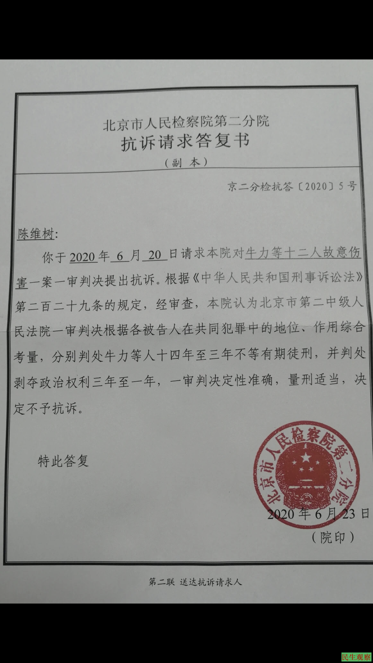 三天后,检方即作出答复:法院对牛力等12人的犯罪事实及量刑情节的认定准确,量刑适当。
