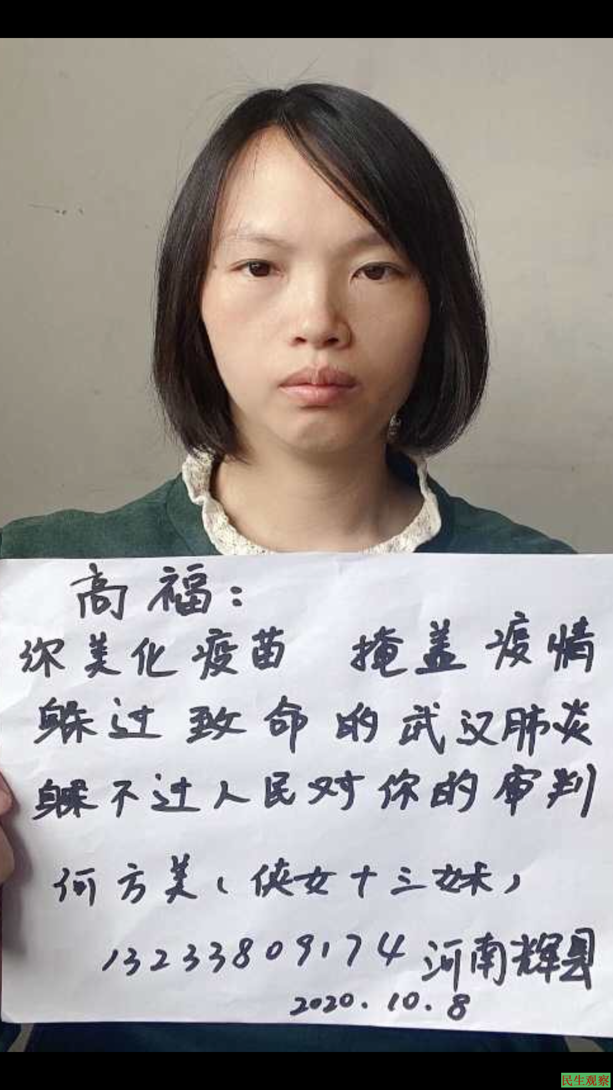 【民生观察2020年10月9日消息】河南辉县疫苗受害者家长何方美的女儿因疫苗致残,之前一直在京作康复治疗。但目前何方美却被非法拘禁在辉县家中,当地部门不但不给孩子解决治疗费用,更不允许她带孩子去北京作康复治疗。