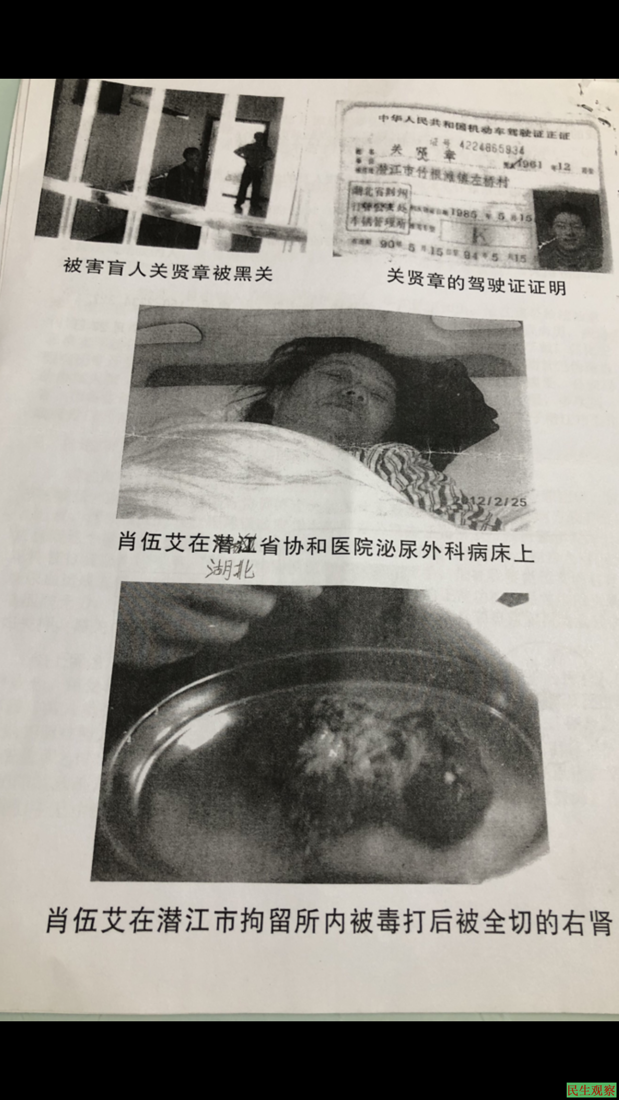 关贤章妻子肖伍艾在为双目失明残疾老公维权中遭到拘押在拘留所里殴打致右肾坏死,如此残忍恶劣行为严重侵犯人权,还有不断的威胁与恐惧伴随,双目失明的残疾关贤章不但没有得到乡政府的照顾,他们去乡政府询问过残疾人福利待遇问题,乡政府部门领导说关贤章不属于福利待遇内,领导干部说:残疾待遇都是英雄内的人,像救死扶伤,见义勇为内造成的残疾人可以享受残疾待遇,关贤章不能享受残疾待遇福利。