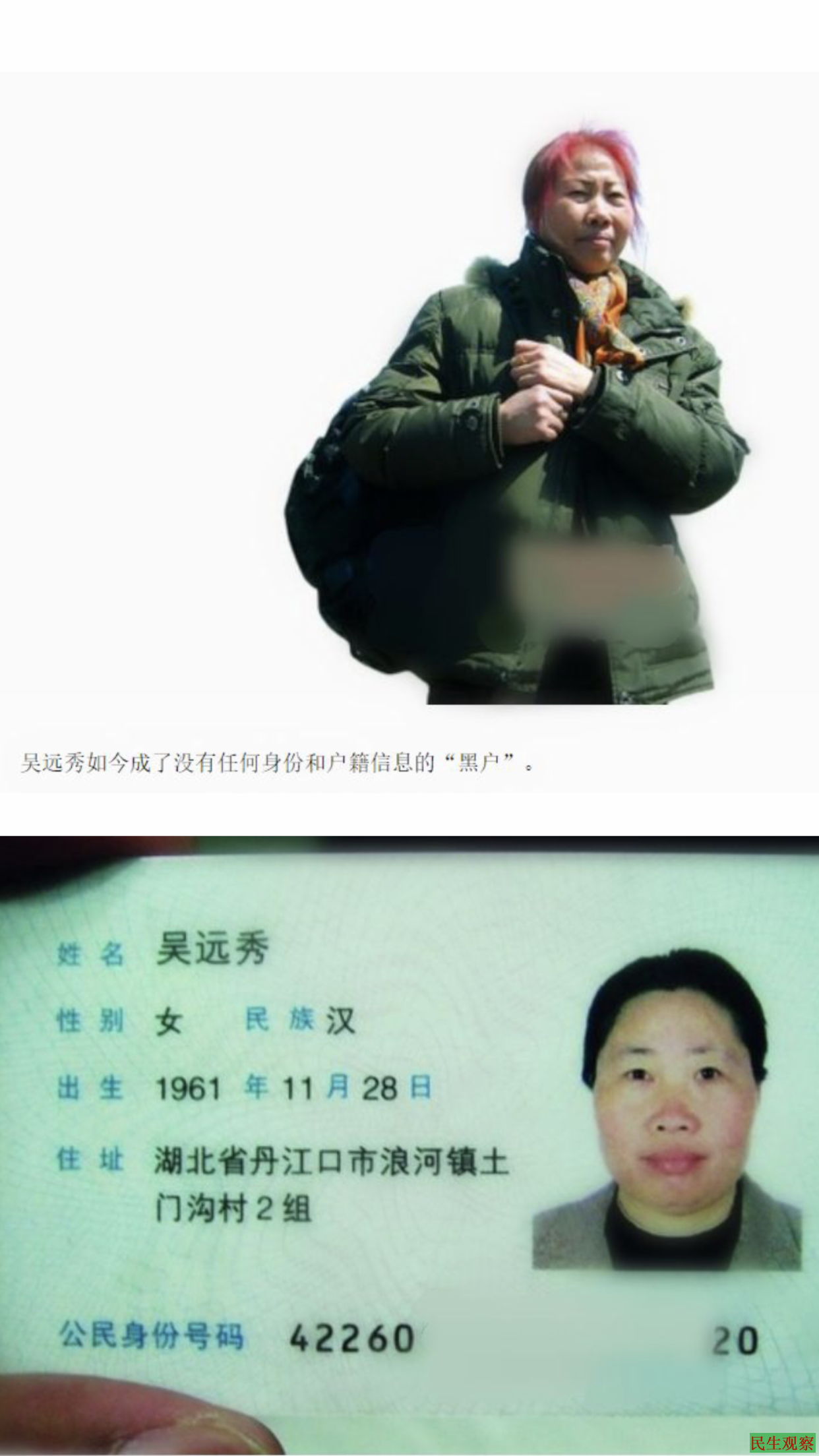 吴远秀的访友王守安告诉本网义工,吴远秀(女)是湖北省丹江口市浪河镇村民,生于湖北嫁到河北的吴远秀近年来为一起跨省官司屡屡上访,上访期间吴多次被截访拘留。2012年初,吴远秀再次到国信局上访,但是官方却告知她其户籍已被注销,所以不再接受她的信访登记。随后吴远秀查到了原因所在:早在11年年11月份,她在湖北的户籍被当地公安机关“秘密”注销。而此前不久,11年年9月份,她的另一处河北籍户口也被当地公安机关“抢先”注销。事件曝光后,有媒体刊文指出,警方维稳不择手段,以注销访民户口为手段,实为掩耳盗铃式维稳。