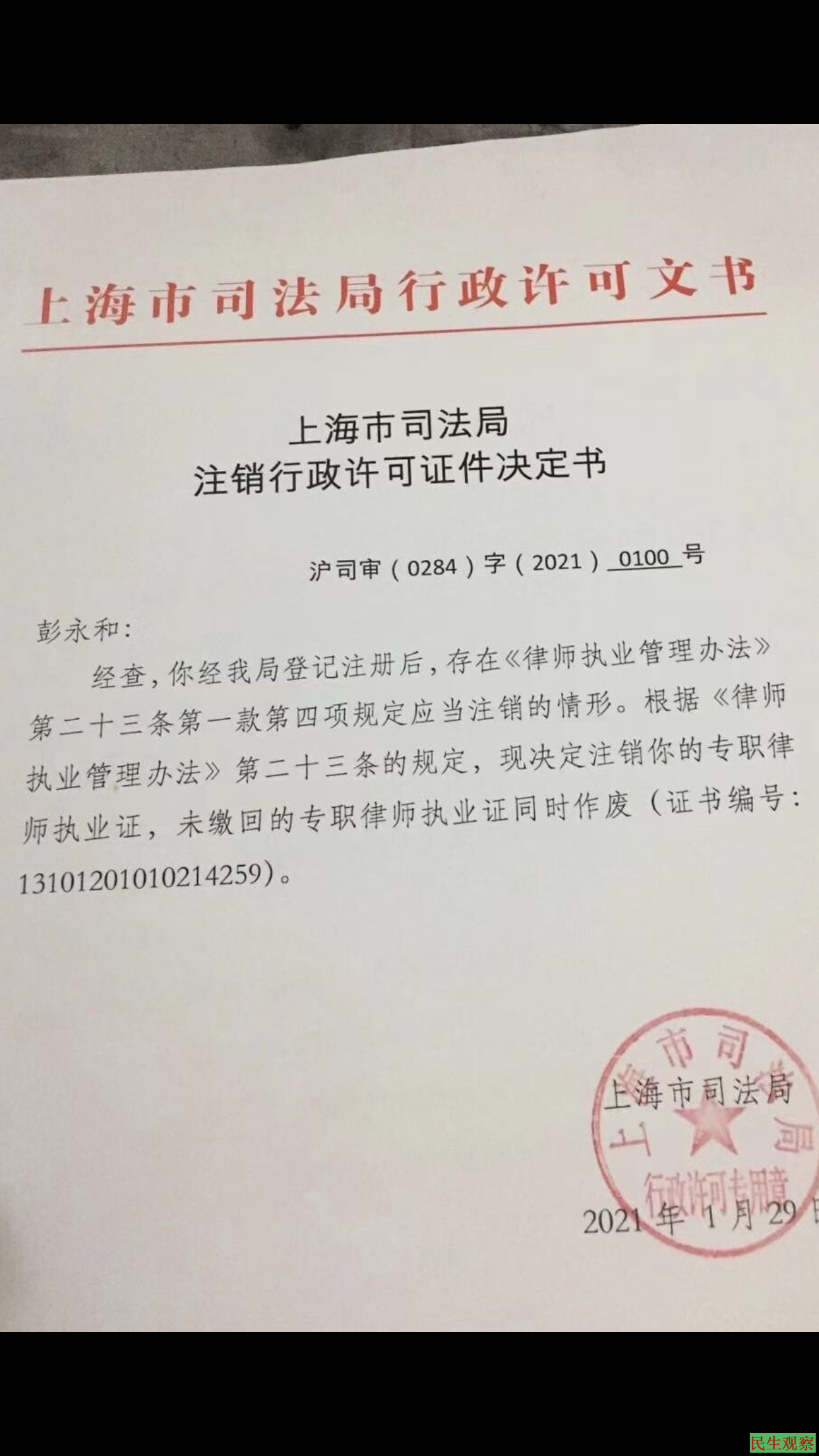 【民生观察2021年2月1日消息】本网获悉,2021年1月30日,上海维权律师彭永和收到了上海市司法局《注销行政许可证件决定书》。