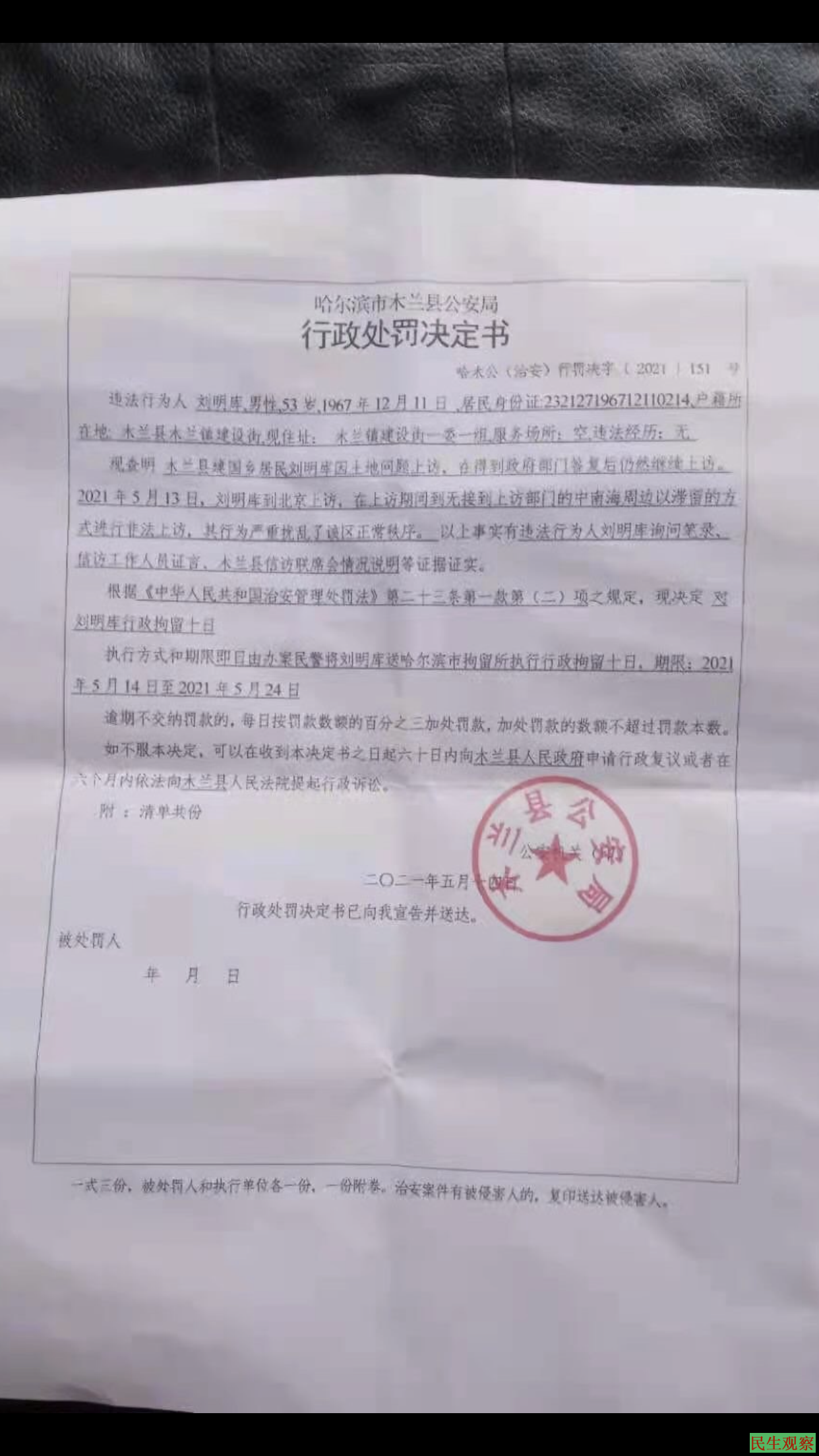 【民生观察2021年5月15日消息】黑龙江省哈尔滨市木兰县建国乡访民刘明库,因土地81亩被前任村书记李丙吉占用,国家每年给的补贴款钱也被前任村书记妻子领取而上访。2021年5月14日,刘明库因进京上访被带回户籍地,随即被木兰县公安局行政拘留10天。