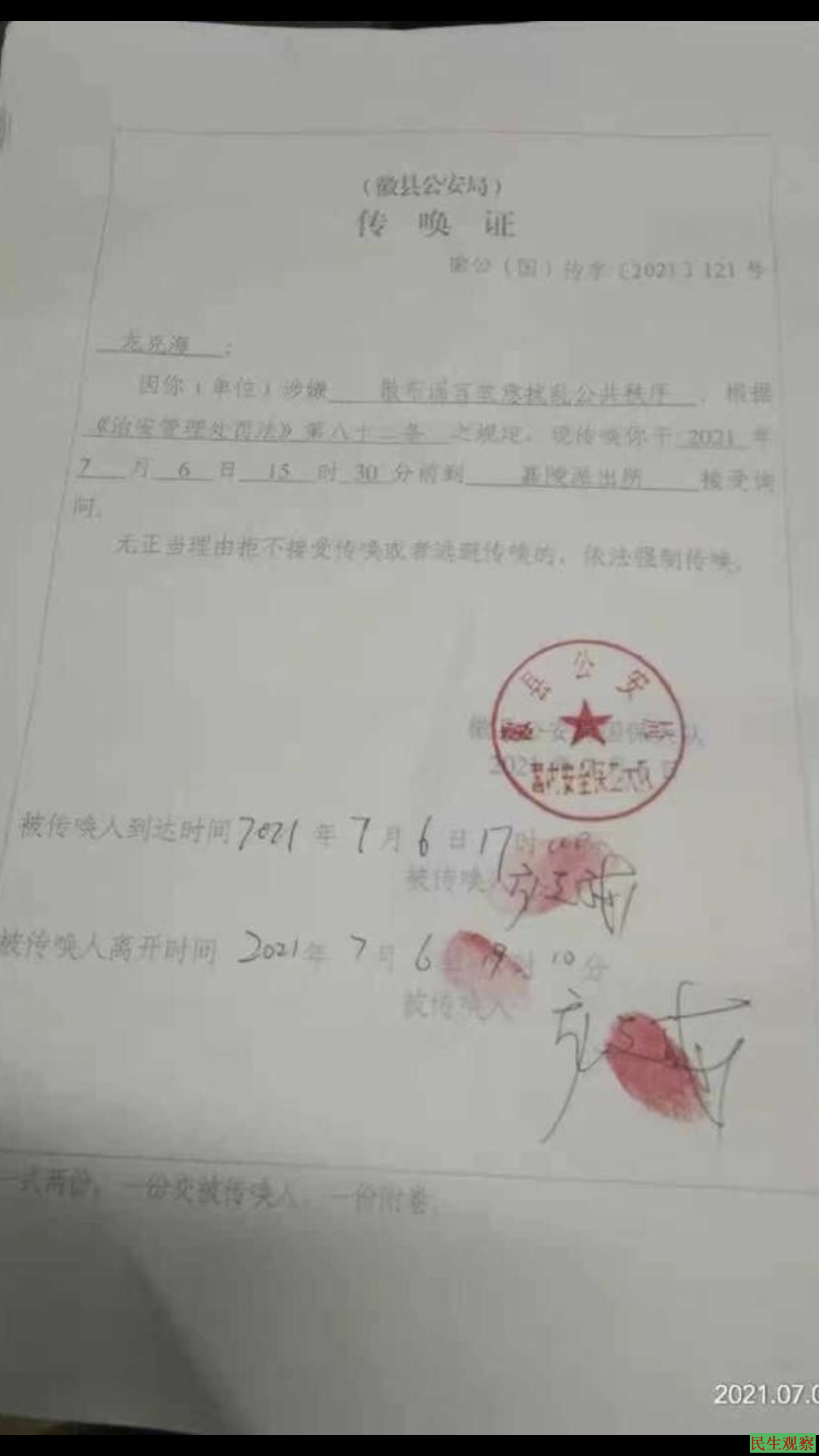 【民生观察2021年7月9日消息】因寻衅滋事罪坐牢一年半,于2020年9月20日刑满释放的中国公民龙克海,于2021年7月6日被甘肃省徽县公安局国内安全保卫大队(以下简称“国保大队”)以“散布谣言,故意扰乱公共秩序”传唤,并出示“证据保全决定书”一式两份,将其两部手机(苹果和OPPO)扣留,后又给予龙克海行政拘留十天的处罚。怪诞的是,国保大队当天并未将龙克海行政拘留,而是带其做了体检后将其送回了家,理由是“拘留所需要排队预约”。