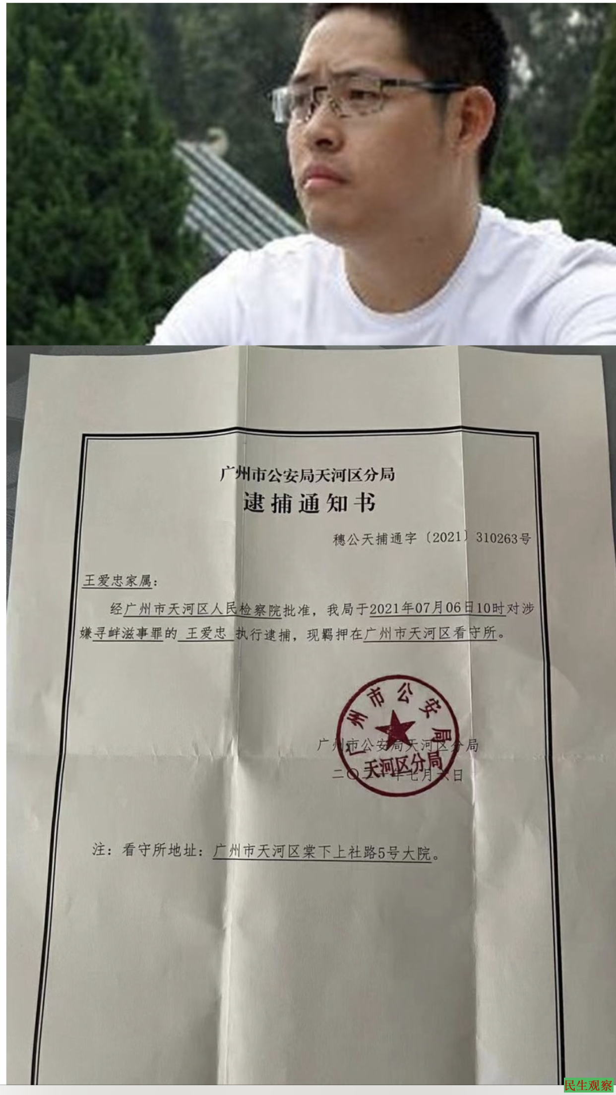 2021年7月6日,在被关押37天以后,王爱忠被天河区检察院以涉嫌寻衅滋事罪批准逮捕,现羁押在广州市天河区看守所。