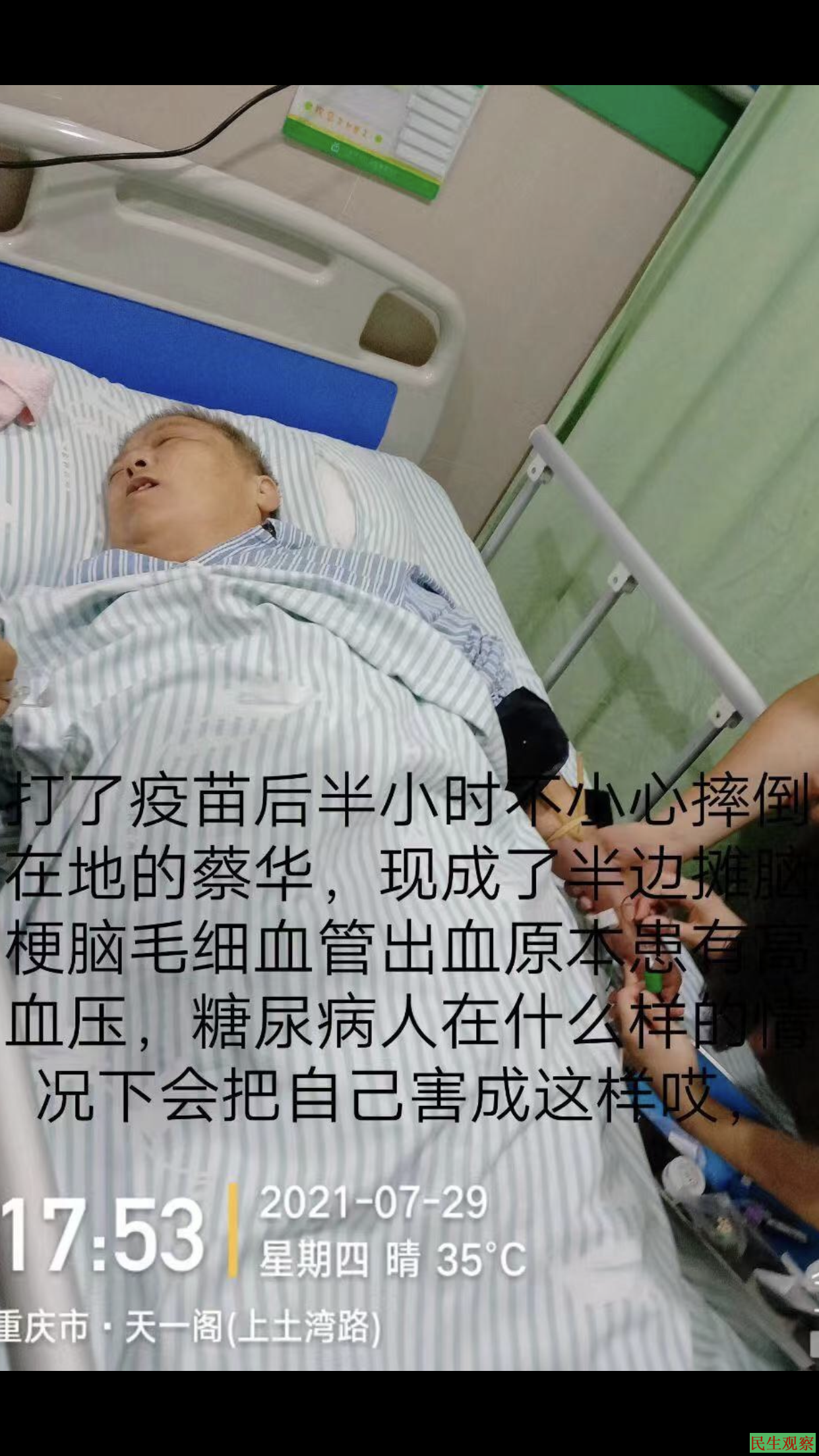 2021年8月2日重庆维权人士蔡邦英发来消息说:我是蔡邦英,我大姐蔡华,家住重庆市沙坪坝区,2021年7月13日我大姐蔡华打了疫苗约半小时起身走,被摔倒在地上就爬不起来。据说当时是现场工作人员打电话,沙区医院120救护车将我姐拖到医院并通知蔡华家人儿子到了医院,病情危急当时区医院建议转上级医院,救护车及医务人员和家属将我姐一同拉到了西南医院,由于没有带钱,医院不给入院救治,医生当时告诉家人说,就算你交了钱,花个二三十万下来,这种情况也未必能治好,儿子看着妈妈这样身上没钱,交不起昂贵的住院费,无奈之下,他们又将蔡华拉回沙区人民医院救治,经诊断为脑梗,脑水肿,治疗十多天下来一直半睡半醒,医生说该用的药都已用了,建议转某个社区医院。