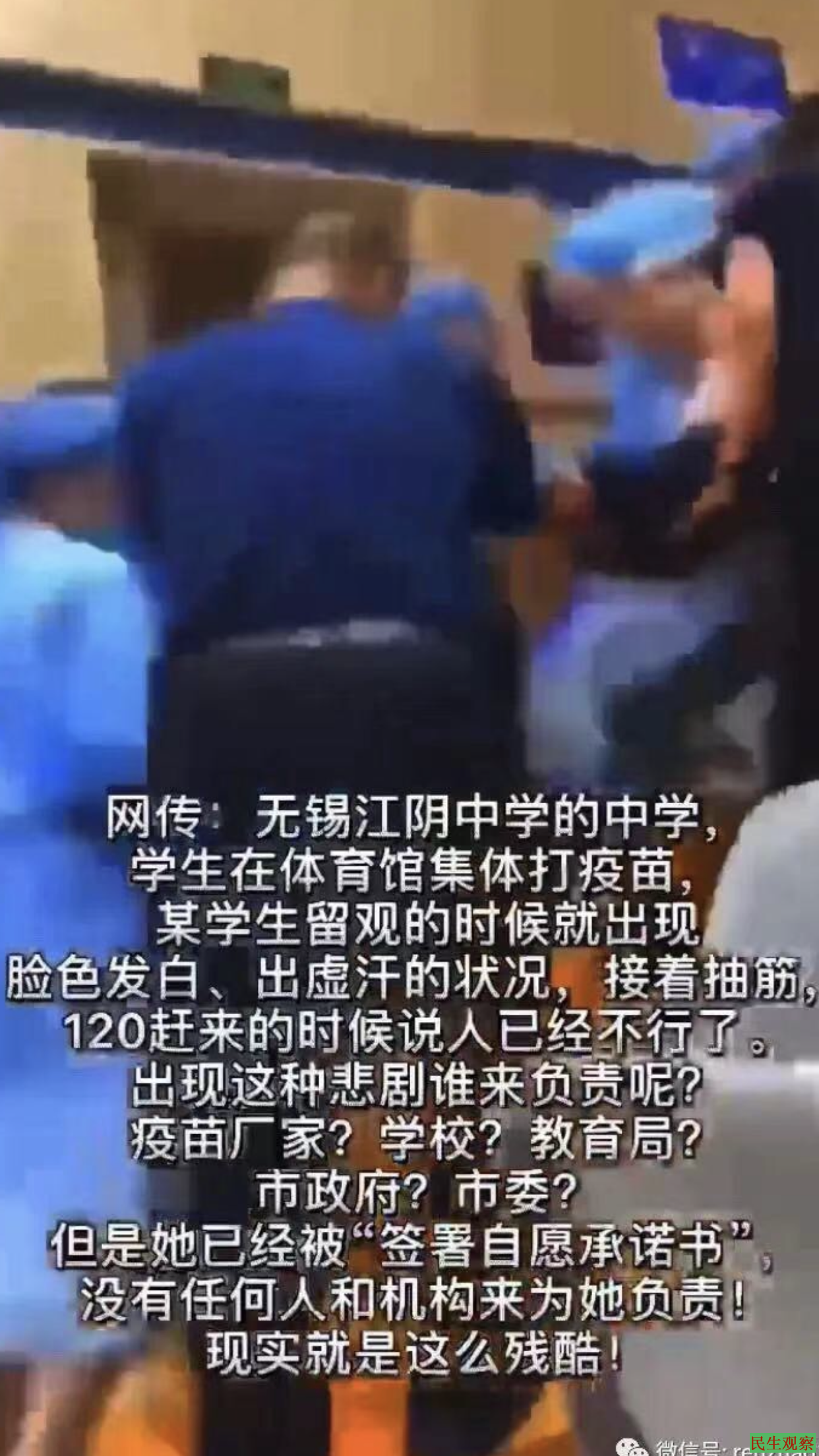就在今天早上,网上流传一个视频,显示一位江苏无锡江阴中学学生在体育馆集中打疫苗,在留观期间出现脸色发白、出虚汗的状况,接着抽筋,120赶来的时候说人已经不行了。