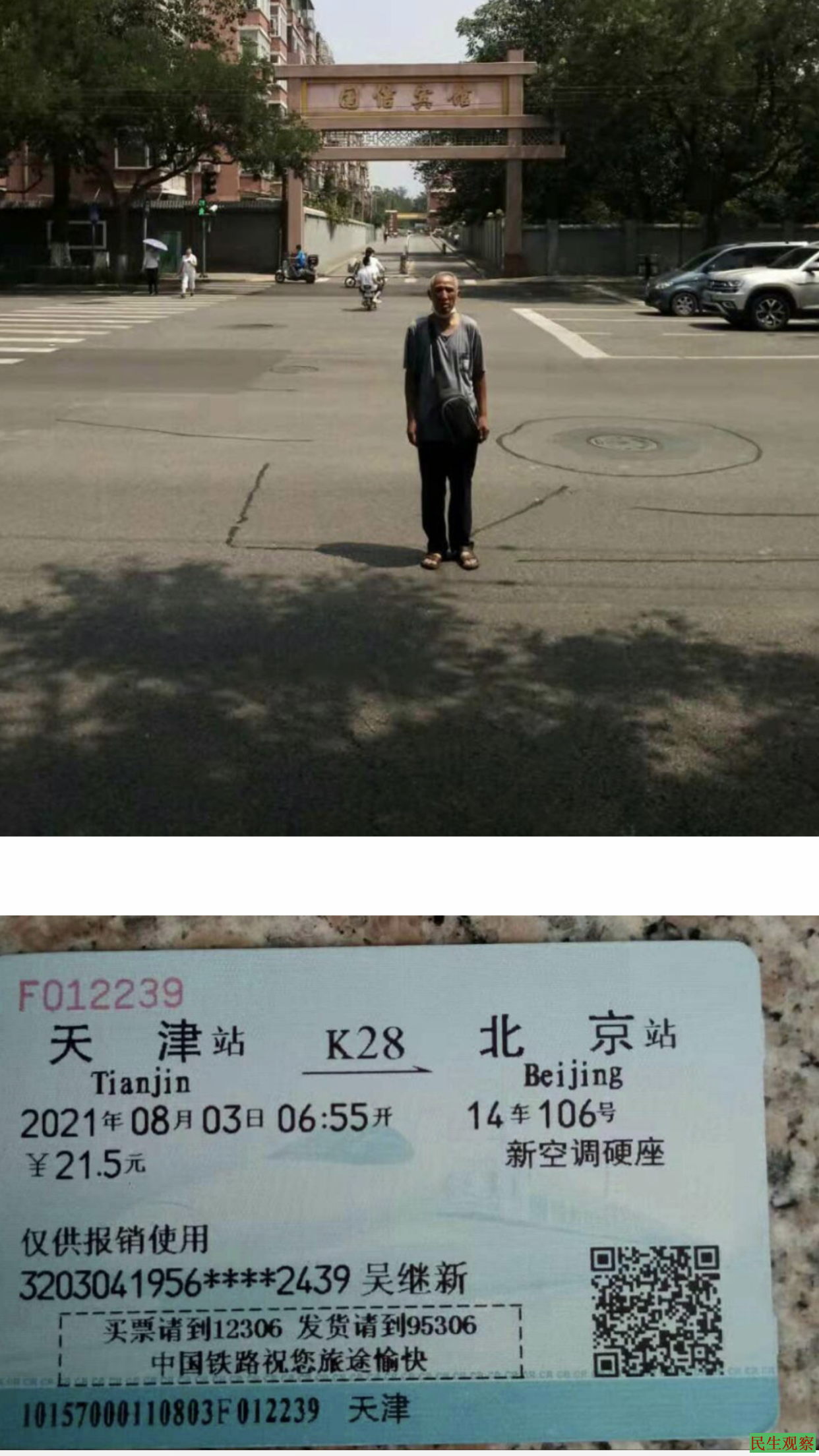 【民生观察2021年8月6日消息】2021年8月1日吴继新在法院门口举牌后就离开江苏徐州转站到南京后再进京维权,到北京后吴继新在自己的出租屋居住,刚到北京的吴继新还没有来得及去各部门登记就被辖区的派出所警察上门,当时吴继新因为外出不在出租屋,警察没有遇到吴继新。吴继新今天在北京国信局宾馆门口拍照留念。