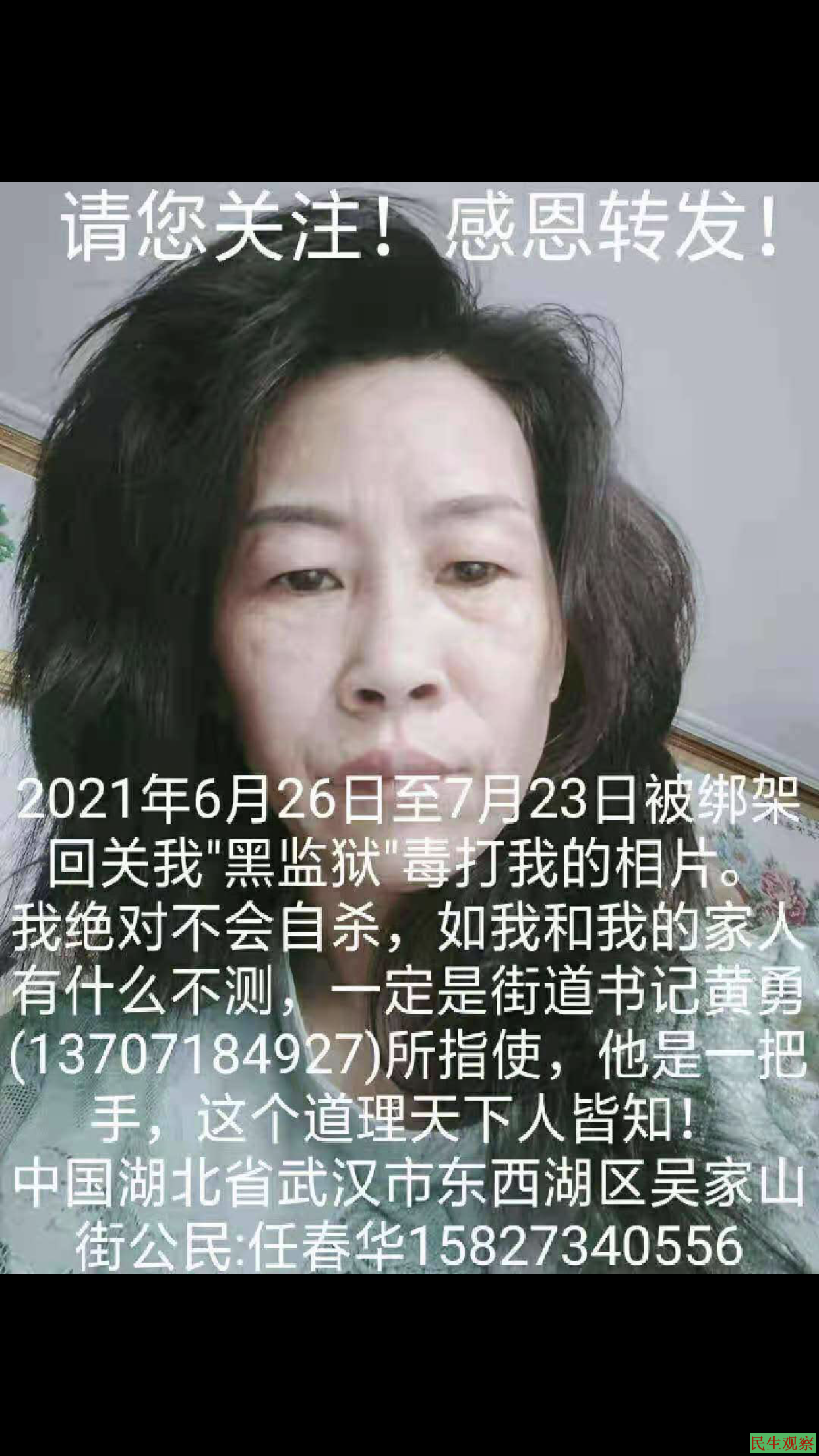 【民生观察2021年8月10日消息】武汉东西湖区访民任春华在百年党庆前夕被非法绑架回当地,被关进所谓的“学习班”实则黑监狱,遭到殴打和惨无人道的虐待,并被逼迫签订息访罢诉协议。