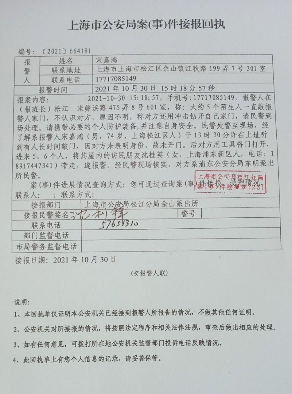 宋嘉鸿称,“随后我到佘山派出所拿到了《报警回执》,确认是浦东新区东明派出所警察所为。我已70多岁,还从未见过警察可以使用冲击钻冲掉我家门锁,冲进我家,在我自主地皮上为所欲为,却没有任何执法文件,《中华人民共和国宪法》算作什么?我已经无法回答了。对此,我将依法追究相关责任人的法律责任。”